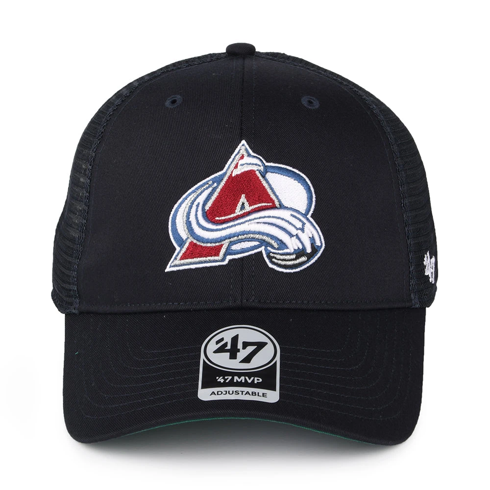 This fantastic Colorado Avalanche navy blue Trucker Cap by ’47 Brand is called the Branson MVP. It features a curved brim and a soft mesh backing so this cap is ready to wear right out of the box. The team logo is embroidered on the front of the cap. The ’47 brand logo is embroidered on the left hand side. There is an adjustable snap at the back which allows this hat to fit most sizes comfortably.