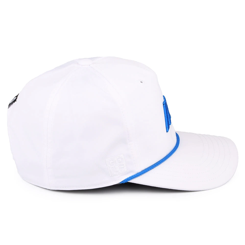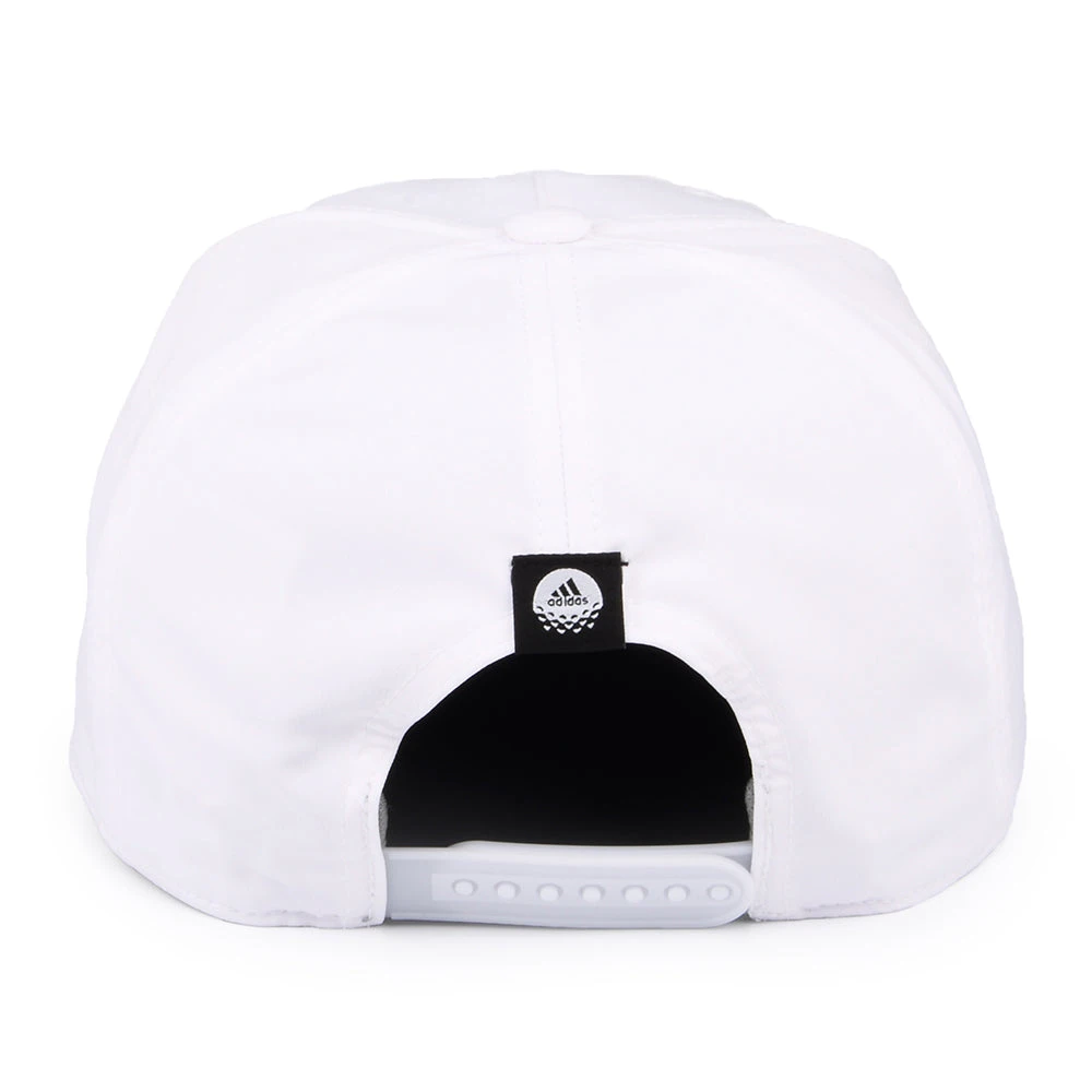 Here is the Adidas Womens Rope Baseball Cap in white. The cap features the Adidas logo embroidered on the front of the hat. There is an Adidas Golf logo embroidered on the side and there is an adjustable snap at the back with an Adidas Golf patch sewn above the snap.