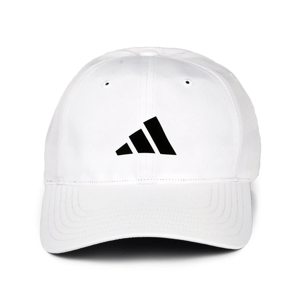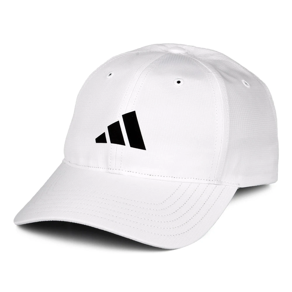 The Tour Badge Recycled Baseball Cap in white is a great hat for the golf course from Adidas. The cap is made of recycled polyester ripstop and features the Adidas logo on the front. The Adidas logo is also on a flip tag next to the adjustable hook-and-loop strap at the back.