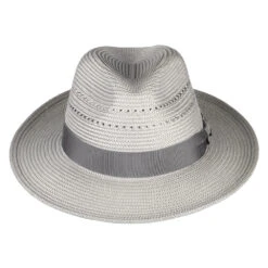 The Bailey Eli Fedora Hat in grey features a unique two-tone braided construction with a grosgrain hatband finished with a contrasting accent and a Bailey badge on the side. Unlined, the hat comes with a cotton sweatband for additional comfort.