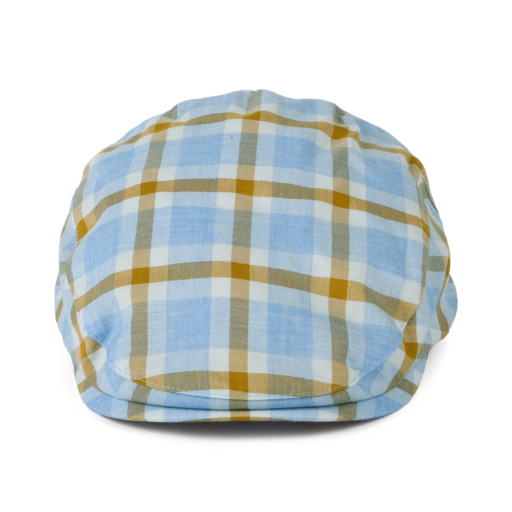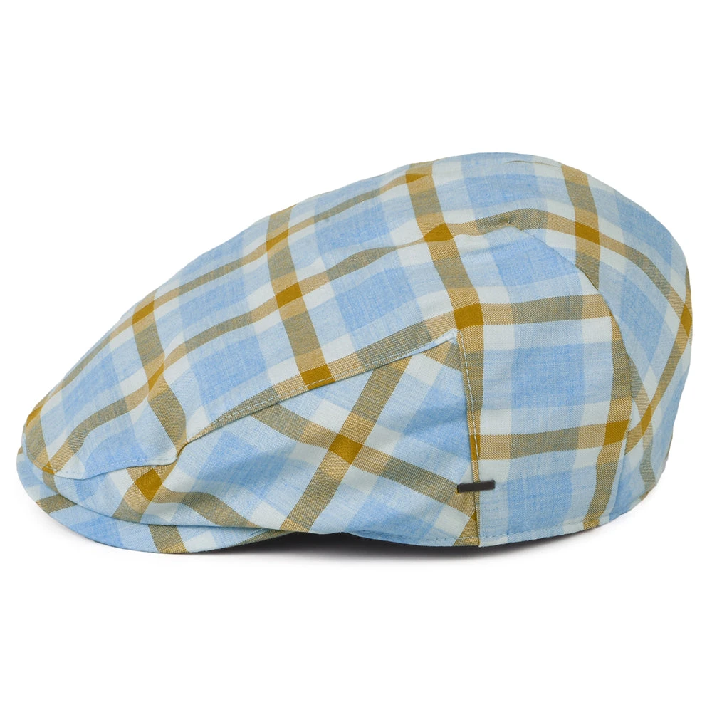 The Helmer Flat Cap in light blue is a great new style from Bailey. The summer flat cap features a colourful plaid pattern and a small Bailey side pin attached to the side of the cap. The cap is lined for added comfort. A great hat for the warm sunny months.