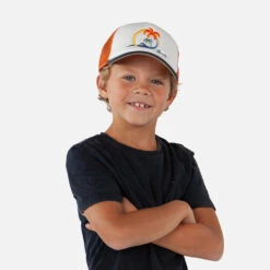 The Barts Kids Surfie Trucker Cap in white-orange features a Barts tropical embroidery on the padded front and a Barts flip tag at the back. An adjustable snapback allows for easy sizing and a comfortable fit.