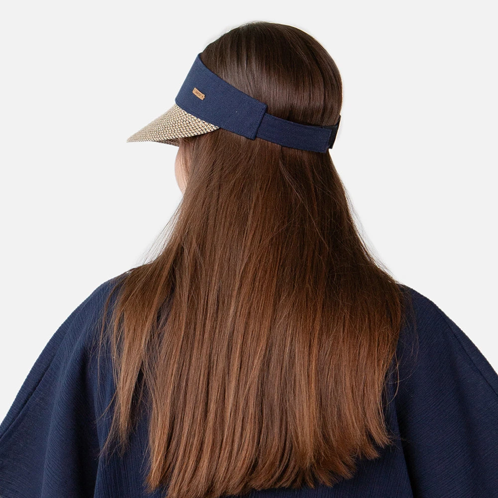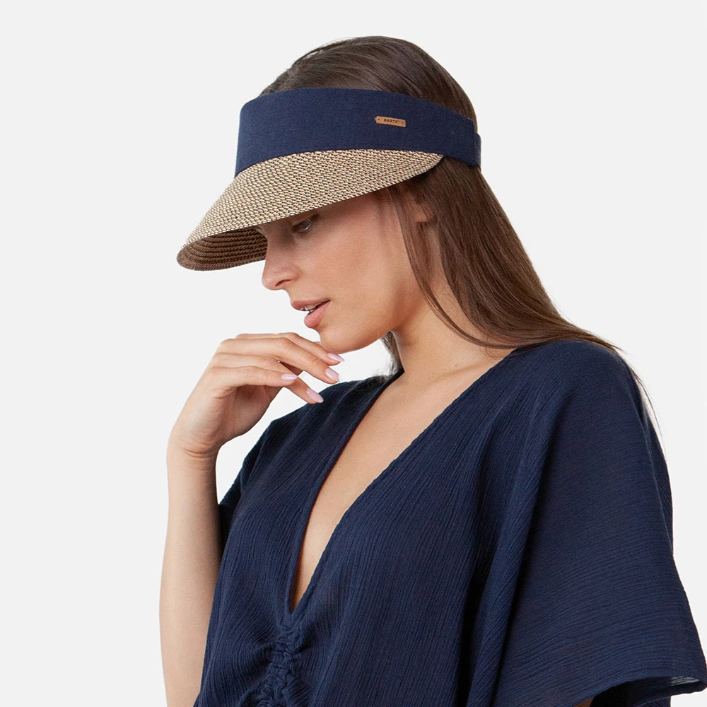 This is the Vesder Visor from Barts in navy-natural. This great visor has a 9 cm wide brim on the front which protects your face and eyes from the sun. On the side of the hatband is a small Barts badge sewn on. At the back is an adjustable hook-and-loop strap for easy sizing. A great visor for the beach or a day in the sun!