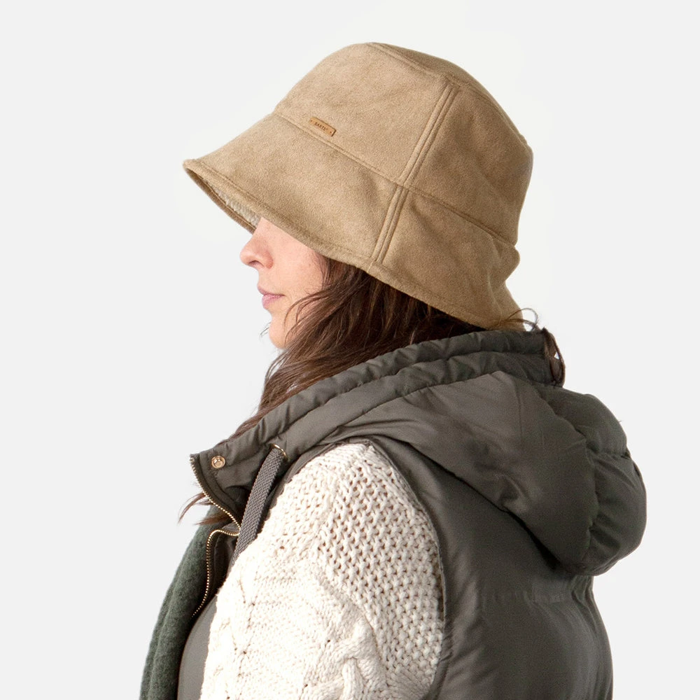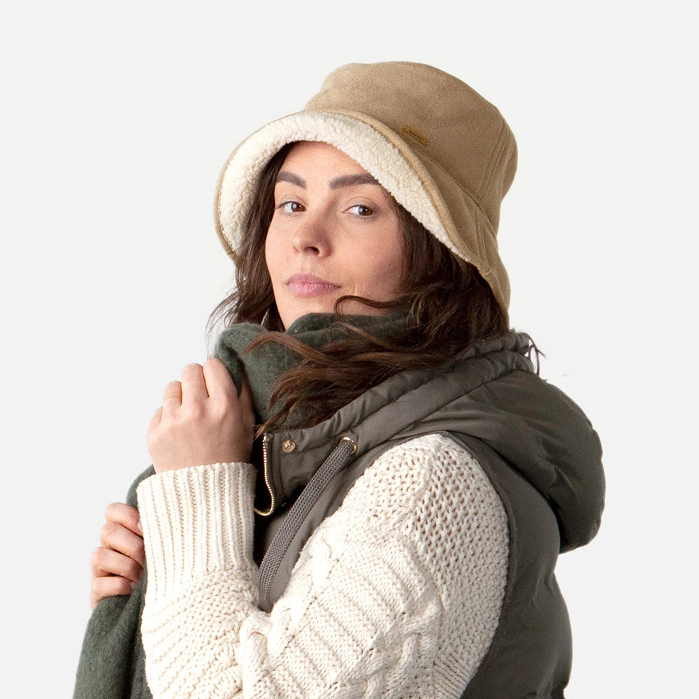 The Barts Yuno Bucket Hat in light brown is made of faux shearling and features a Barts tag sewn on the side. The sweatband in the inside comes with an adjustable hook-and-loop strap so it fits comfortably. The inside also comes with a faux sherpa lining to keep you warm on cold days. A great bucket hat for the winter!