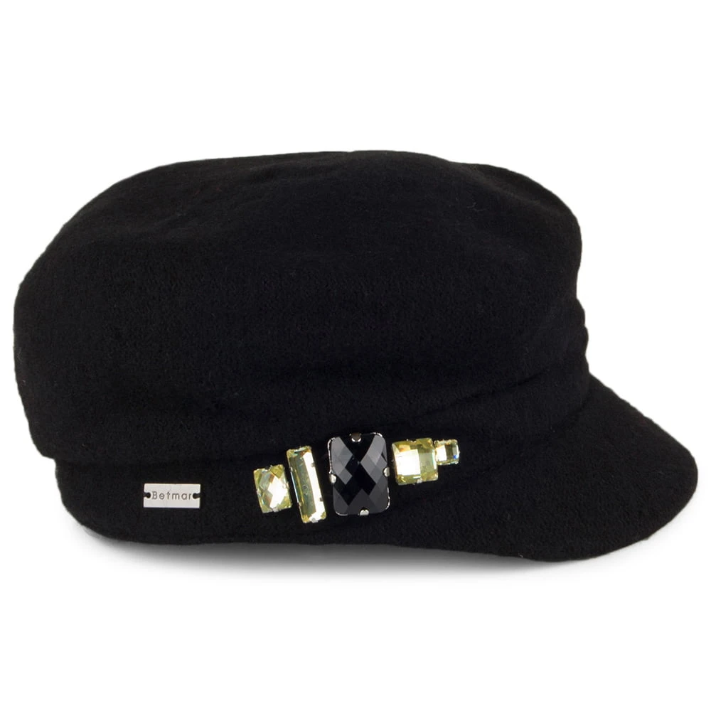 The Rhinestone Baker Boy Cap in black from Betmar is a fantastic, soft wool blend winter hat to keep you warm. There are some bold rhinestones on the side of the hat and the Betmar pin is sewn next to it. This must have item for winter is the perfect addition to any wardrobe.