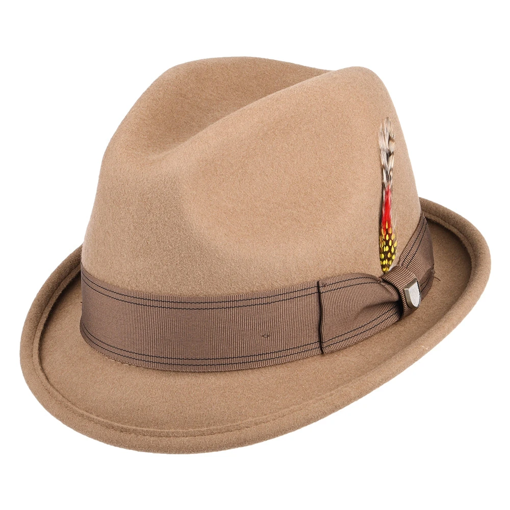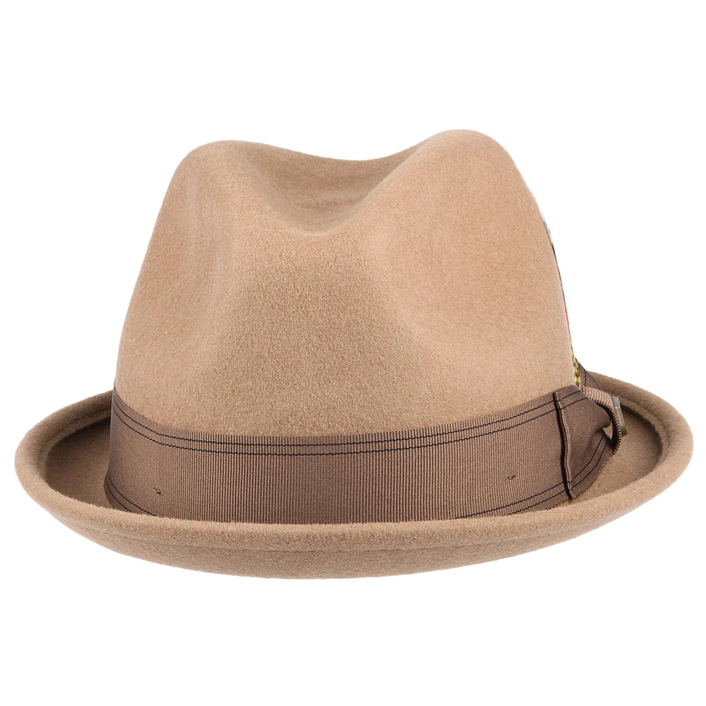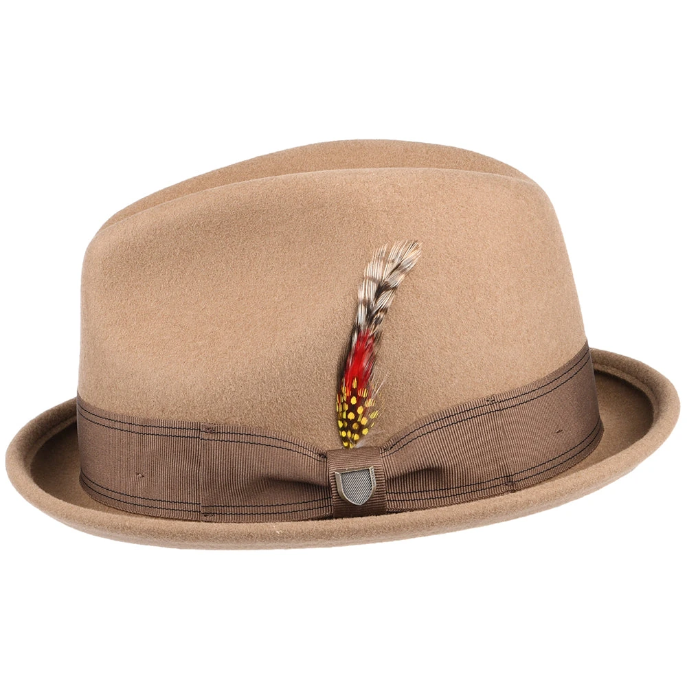 The Brixton Gain Wool Felt Trilby in khaki is a stingy brim trilby made from 100% wool felt. A grosgrain band surrounds the crown and comes complete with a Brixton pin and side feather. The hat is fully lined with satin and the cotton sweatband comes with an adjustable hook and loop strap for a perfect fit. The wool used to make this hat is cruelty free certified by the RWS, a voluntary standard that addresses the welfare of sheep and the land on which they graze.