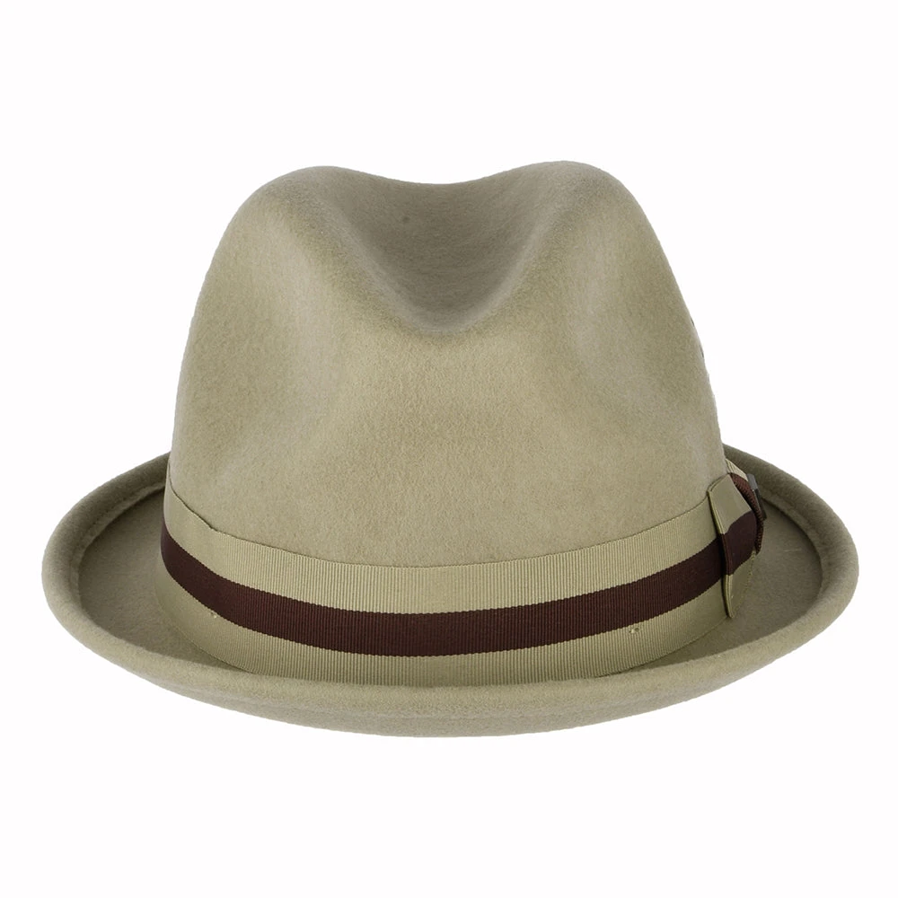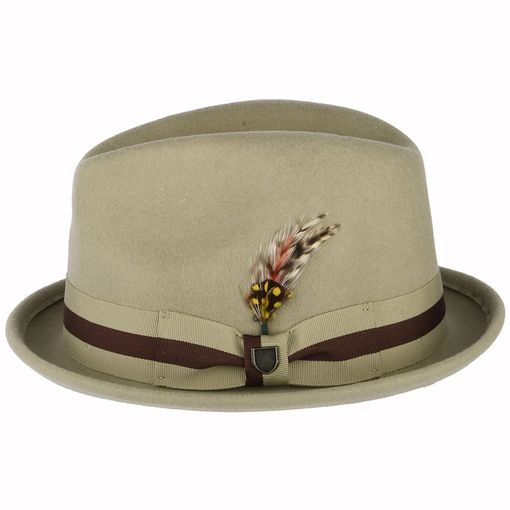 The Brixton Gain Wool Felt Trilby in sand-brown is a stingy brim trilby made from 100% wool felt. A striped grosgrain band surrounds the crown and comes complete with a Brixton side pin and removable feather. The hat is fully lined with satin and the cotton sweatband comes with an adjustable hook and loop strap for a perfect fit. The wool used to make this hat is cruelty free certified by the RWS, a voluntary standard that addresses the welfare of sheep and the land on which they graze.