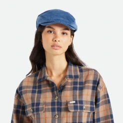 The Brixton Hooligan Corduroy flat cap in blue is made of 100% cotton. A metal Brixton pin can be found at the back of the cap towards the left side and the crown is affixed to the brim with a single press stud. The interior of the cap is lined with satin and features a cotton sweatband.