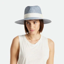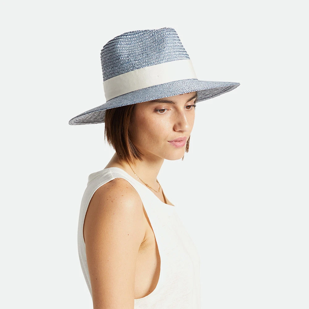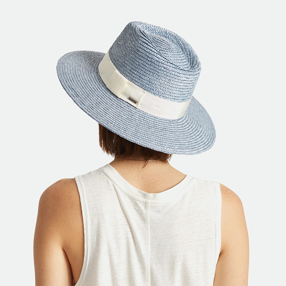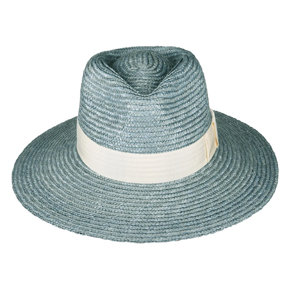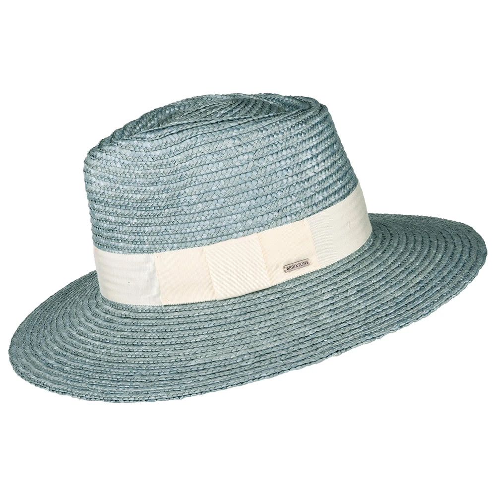 The Brixton Hats Joanna Short Brim Straw Sun Hat in ice blue is a fantastic summer hat. This fedora styled sun hat features a tear drop, or c-crown shape, which is teamed with an extra long, downward facing brim and adorned with a grosgrain ribbon. The brim width on this hat is 9cm, while the crown height is 12cm. The cotton sweatband comes with an adjustable hook and loop strap for a perfect fit.