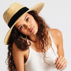 The Brixton Hats Joanna Straw Sun Hat in natural is a fantastic summer hat thanks to its UPF 50+ sun protection rating. This fedora styled sun hat is made of 100% wheat straw and features a tear drop, or c-crown shape, which is teamed with an extra long, downward facing brim and adorned with a grosgrain ribbon. The brim width on this hat is 10.5cm, while the crown height is 12cm. The cotton sweatband comes with an adjustable hook and loop strap for a perfect fit.
