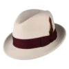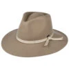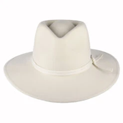 The Brixton Hats Joanna Wool Felt Fedora Hat in off white is fully packable and therefore great for travelling. This elegant fedora hat features a hat band knotted on the side and a metal Brixton pin sewn just above. The hat is unlined and the cotton sweatband comes with an adjustable hook and loop strap for a perfect fit. The wool used to make this hat is cruelty free certified by the RWS, a voluntary standard that addresses the welfare of sheep and the land on which they graze.