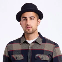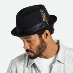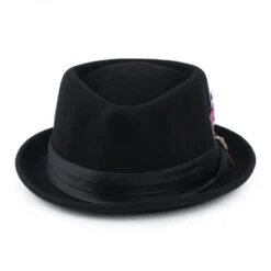 The Brixton Stout in black is an exceedingly cool diamond crown pork pie. The hat has a three pleat satin hat band and comes complete with Brixton pin and removable feather on the side. The crown is 10cm (3 3/4 inches) high and the brim is a stingy 3.5cm (1 5/8 inches) wide. The cotton sweatband comes with an adjustable hook and loop strap for a perfect fit. The wool used to make this hat is cruelty free certified by the RWS, a voluntary standard that addresses the welfare of sheep and the land on which they graze.