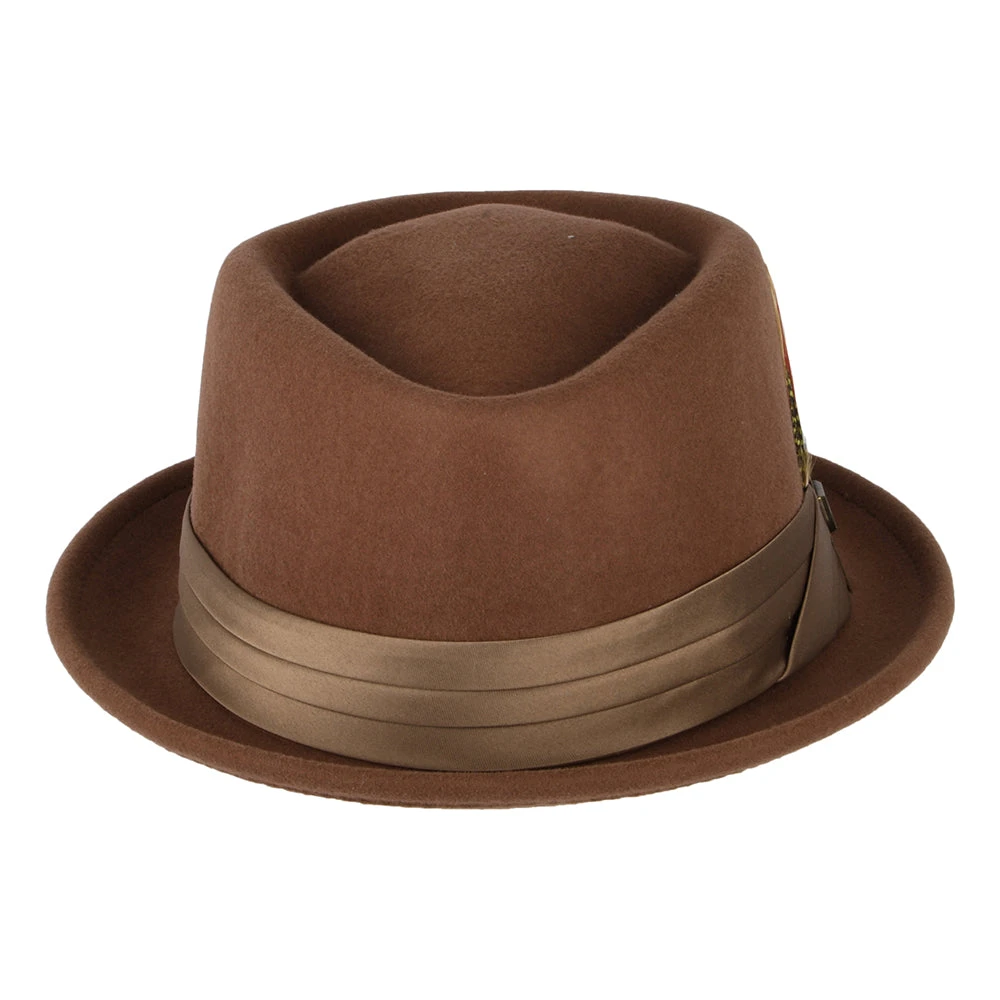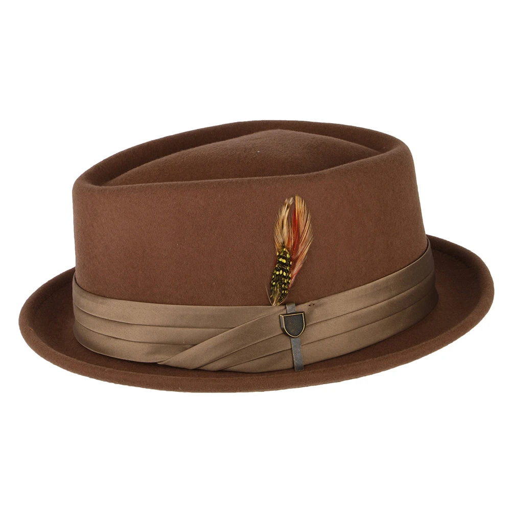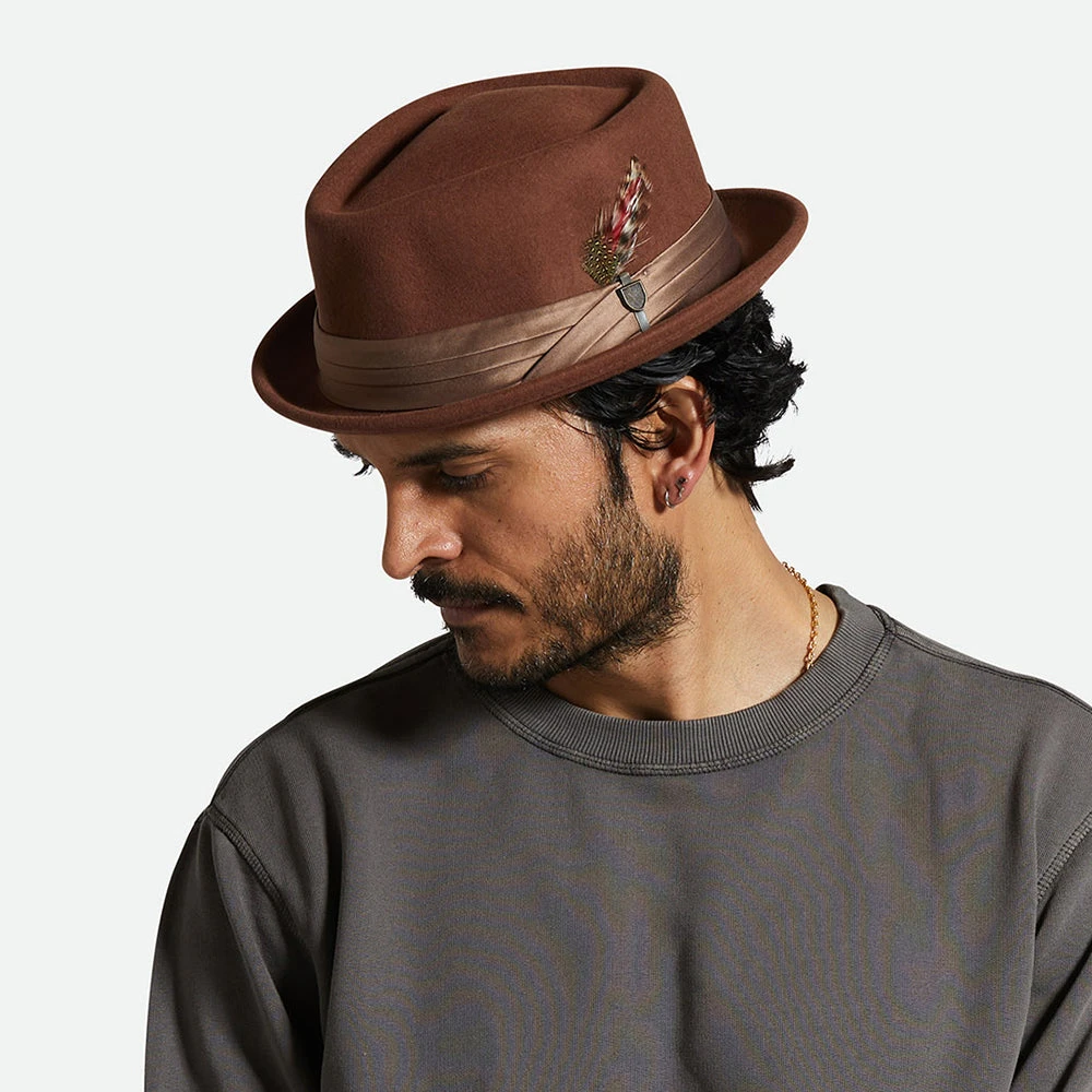 The Brixton Stout in brown-bronze is an exceedingly cool diamond crown pork pie. The hat has a three pleat satin hat band and comes complete with Brixton pin and removable feather on the side. The crown is 10cm (3 3/4 inches) high and the brim is a stingy 3.5cm (1 5/8 inches) wide. The cotton sweatband comes with an adjustable hook and loop strap for a perfect fit. The wool used to make this hat is cruelty free certified by the RWS, a voluntary standard that addresses the welfare of sheep and the land on which they graze.