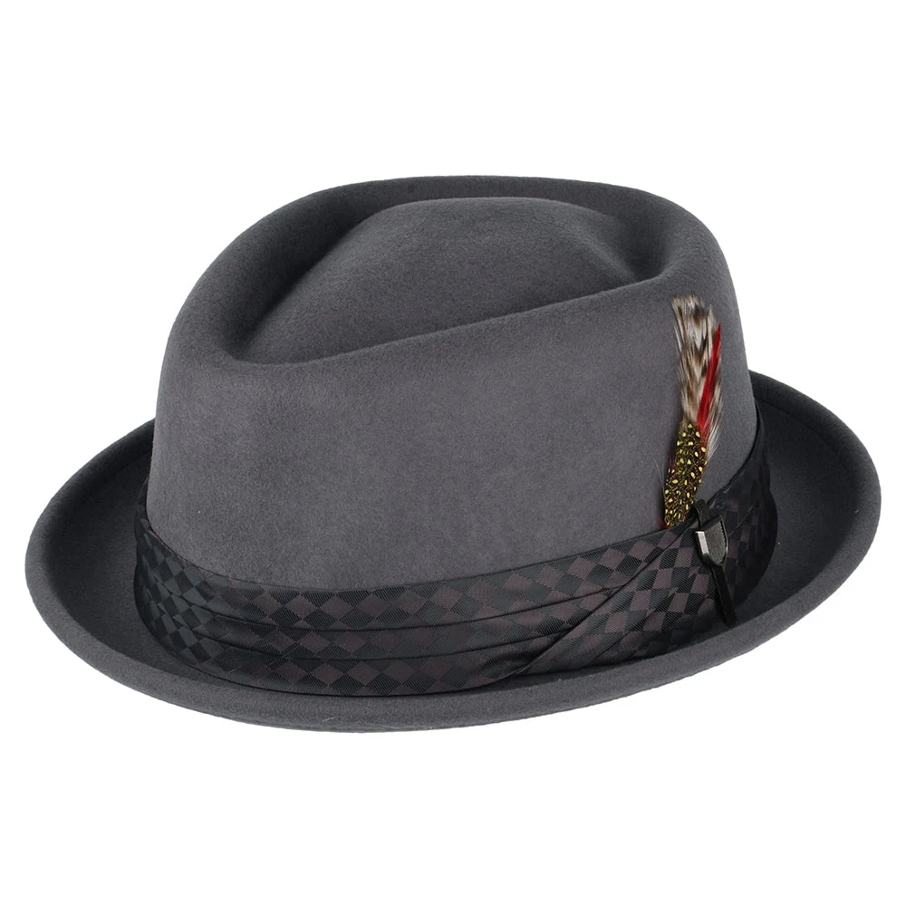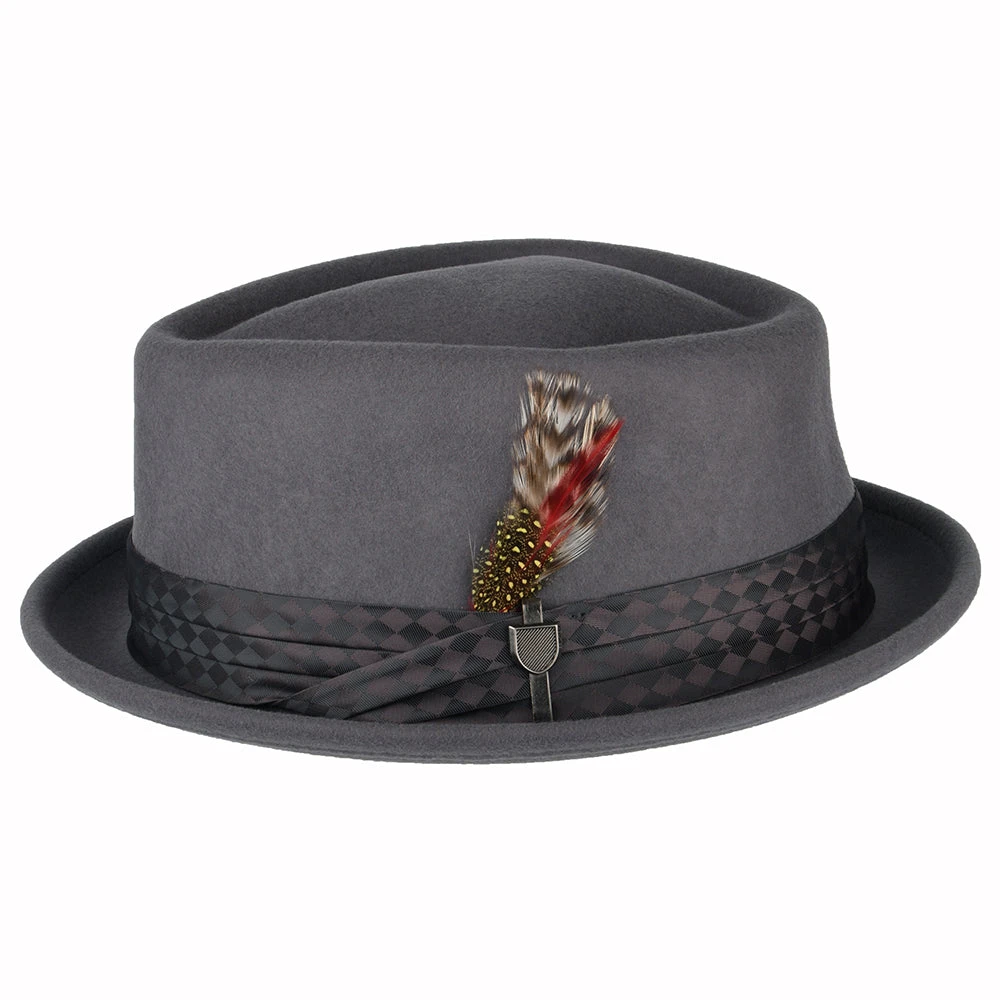 The Brixton Stout in mid grey is an exceedingly cool diamond crown pork pie. The hat has a three pleat check pattern satin hat band and comes complete with Brixton pin and removable feather on the side. The crown is 10cm (3 3/4 inches) high and the brim is a stingy 3.5cm (1 5/8 inches) wide. The cotton sweatband comes with an adjustable hook and loop strap for a perfect fit. The wool used to make this hat is cruelty free certified by the RWS, a voluntary standard that addresses the welfare of sheep and the land on which they graze.