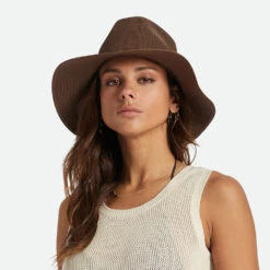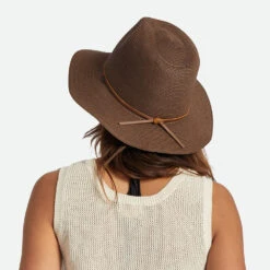 The Wesley Packable Straw Fedora Hat in brown is a new take on Brixton’s famous shape. Made of 100% paper straw, this packable summer hat is unlined for additional breathability. The cotton sweatband comes with an adjustable hook and loop strap for a perfect fit. The leather hat band is finished with a Brixton badge sewn on the side and the floppy brim measures approximately 7.5cm wide.