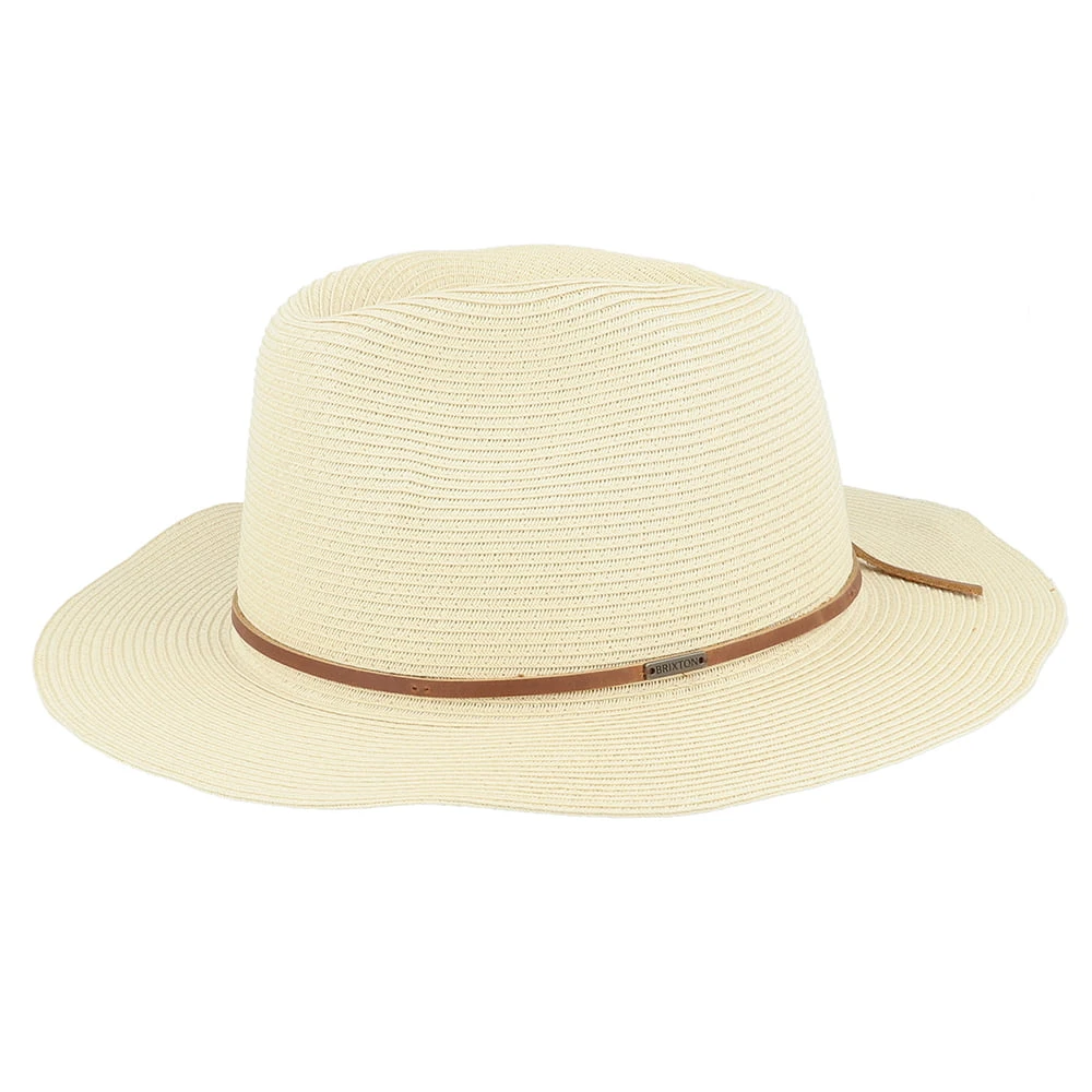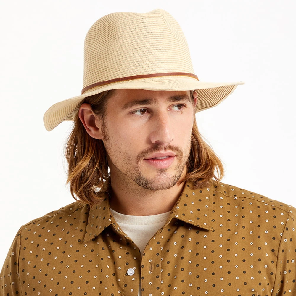 The Wesley Packable Straw Fedora Hat in tan is a new take on Brixton’s famous shape. Made of 100% paper straw, this packable summer hat is unlined for additional breathability. The cotton sweatband comes with an adjustable hook and loop strap for a perfect fit. The leather hat band is finished with a Brixton badge sewn on the side and the floppy brim measures approximately 7.5cm wide.