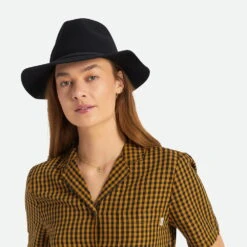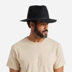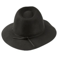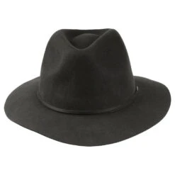 The Brixton Wesley Packable Wool Felt Fedora Hat in washed black has a floppy brim with a raw edge and a leather hat band finished with a Brixton badge on the side. This simple yet elegant fedora is currently one of the most popular styles in fashion. The hat is unlined and the cotton sweatband comes with an adjustable hook and loop strap for a perfect fit.
