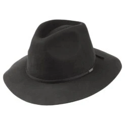 The Brixton Wesley Packable Wool Felt Fedora Hat in washed black has a floppy brim with a raw edge and a leather hat band finished with a Brixton badge on the side. This simple yet elegant fedora is currently one of the most popular styles in fashion. The hat is unlined and the cotton sweatband comes with an adjustable hook and loop strap for a perfect fit.