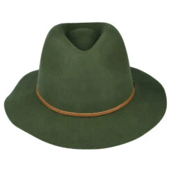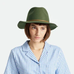 The Brixton Wesley Wool Felt Fedora Hat in olive has a brim with a raw edge, a leather band and a Brixton pin on the side. This simple yet elegant fedora is currently one of the most popular styles in fashion. The hat is unlined and the cotton sweatband comes with an adjustable hook and loop strap for a perfect fit.