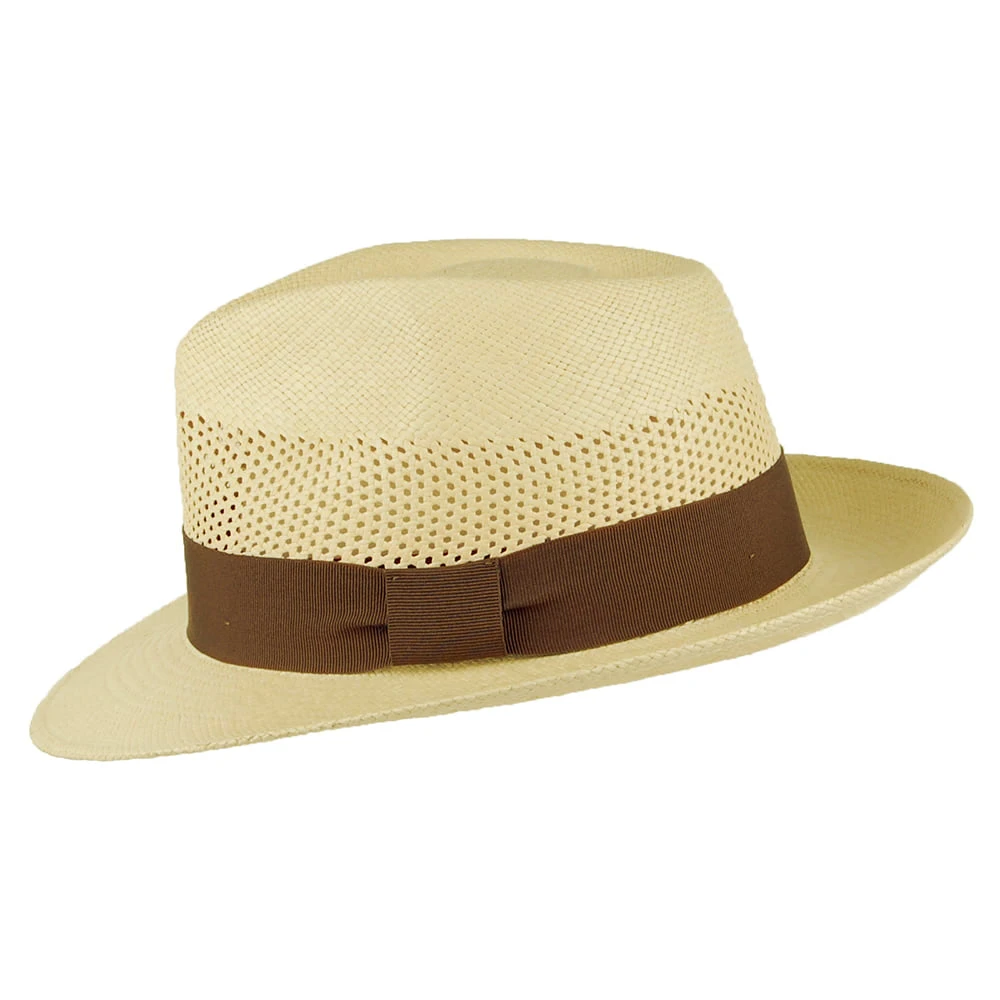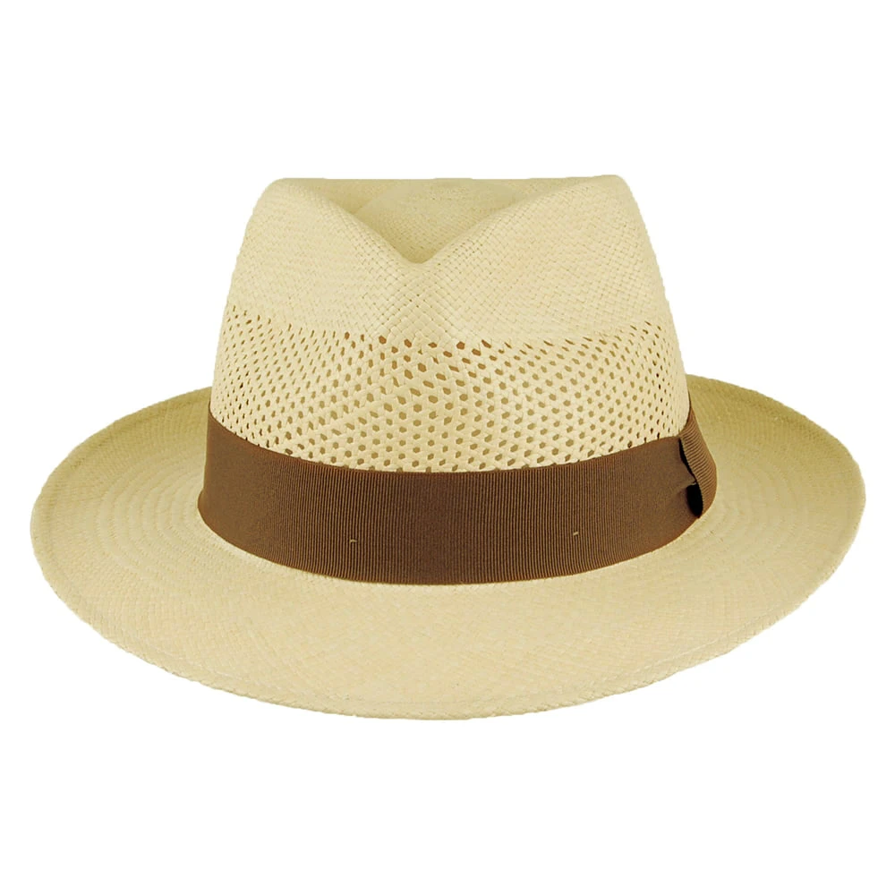 The City Sport Vented Panama Hat in natural is a genuine panama that has been hand made in Ecuador. The straw of the crown is woven to create a pattern of vents which looks great and keeps the wearer cool. A grosgrain hat band surrounds the bottom of the crown. A smooth sweatband inside the hat ensures it is comfortable to wear.