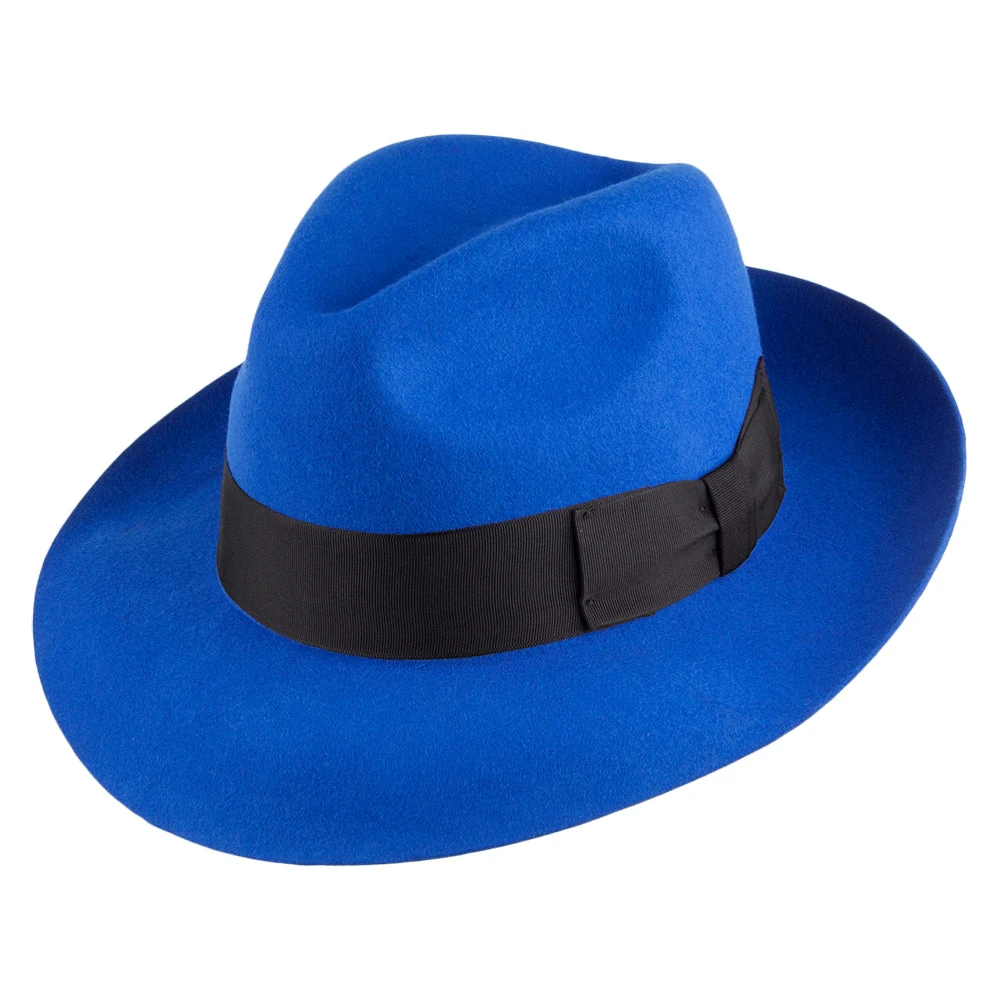 The Mayfair Wool Felt Fedora in cobalt is one of the most elegant and practical hats in the Denton line. The classically designed fedora has a 6cm turn down brim and a 11.5cm high crown crown. It also features a grosgrain hat band and is fully lined in satin and has a leather sweatband.