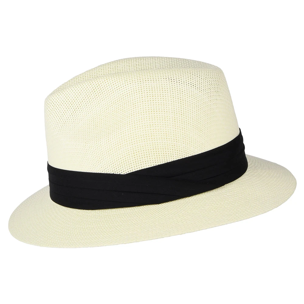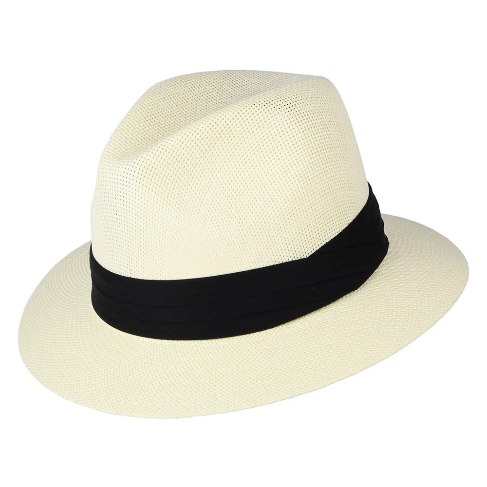 The Dorfman Pacific Matte Toyo Straw Safari Fedora Hat in ivory is an eye-catching summer hat. The unique weave of the straw gives this hat a subtle difference that looks great and stands out from the crowd. A three pleat hat band finishes the hat. Lastly this unlined hat comes with a cotton sweatband for comfort.