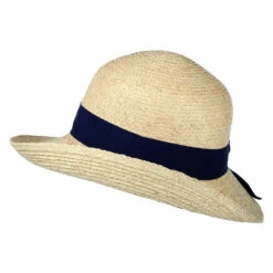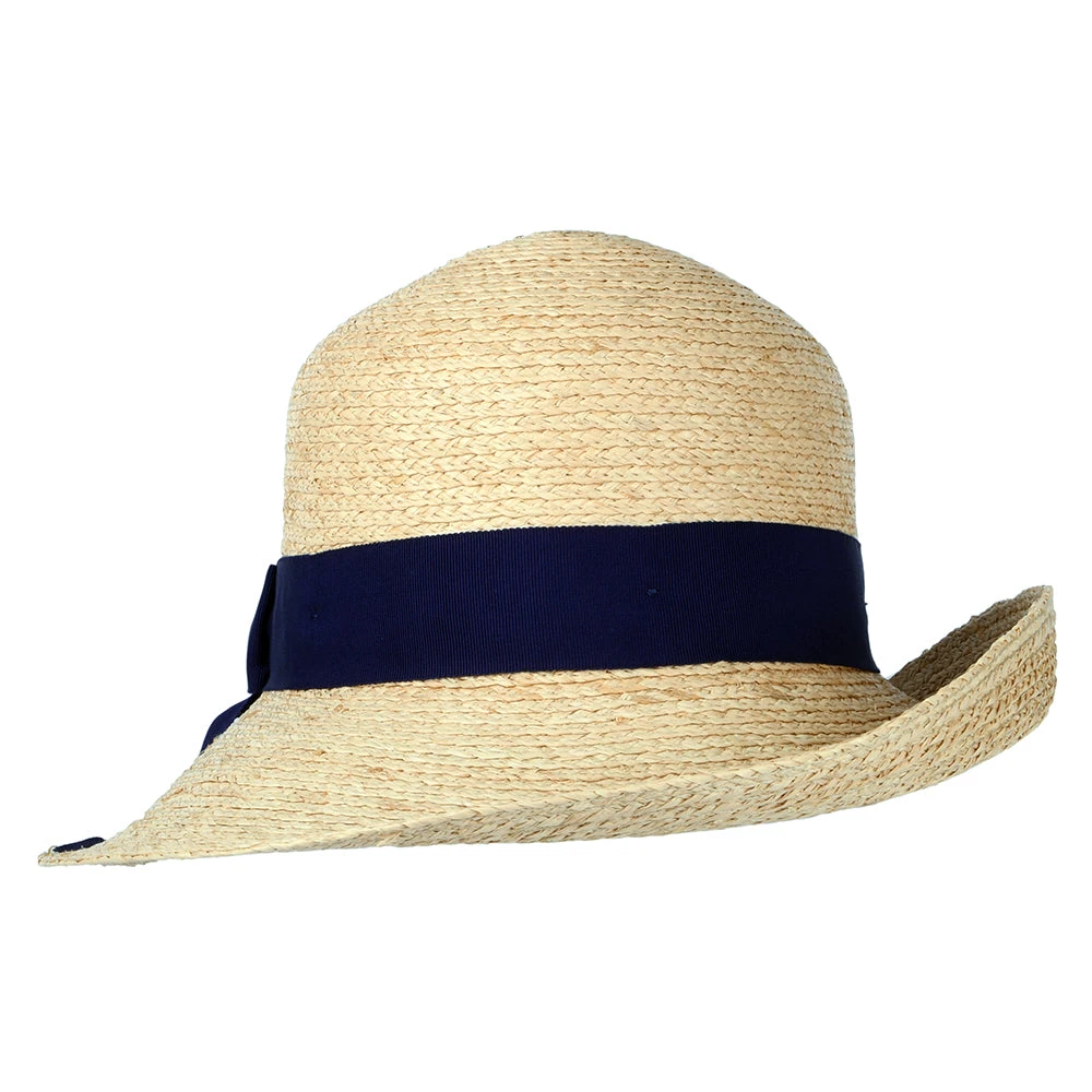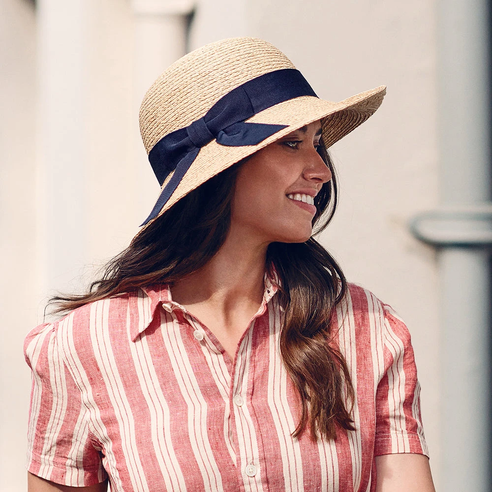 The Bronte Straw Sun Hat in natural from Failsworth features a beautiful navy blue grosgrain hat band with bow on the side. The asymmetrical brim features a curl on the side giving the hat a great look. The inside of the hat is unlined and comes with an adjustable sweatband to ensure a great fit. This is a fantastic new summer style.