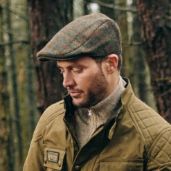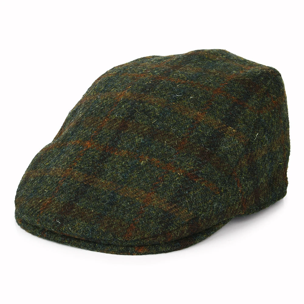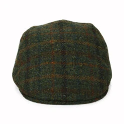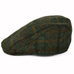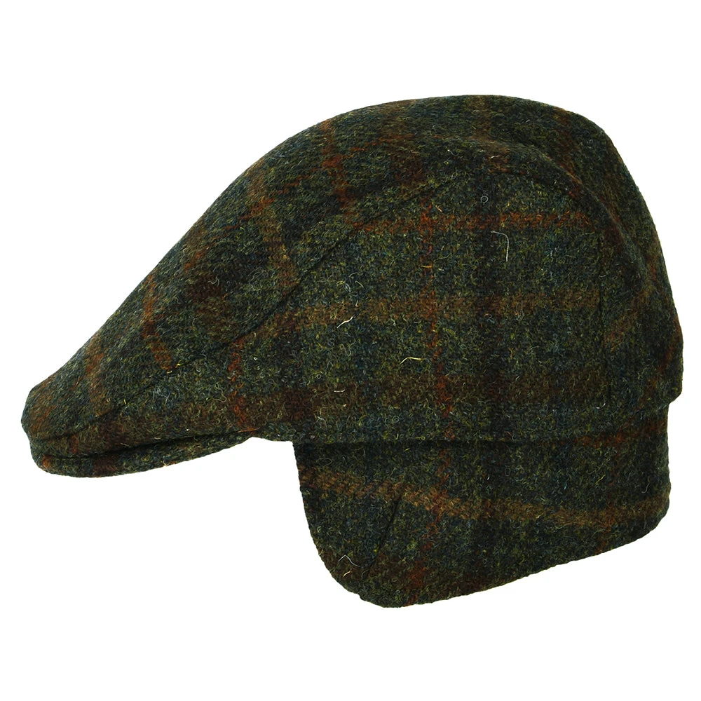 This is the Harris Tweed Checked Oban Flat Cap with Earflaps in olive-rust from Failsworth. This beautiful flat cap has fold down earflaps, which gives this cap its distinctive look. It has a sewn down brim. In the inside is a quilted satin lining and a grosgrain sweatband for extra comfort. This cap is the perfect outdoor winter hat.