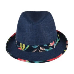 The Malibu Toyo Straw Trilby Hat in navy blue from Failsworth is the perfect summer hat. The brim of this trilby is folded down at the front and curled up at the back. The hat is decorated with a fun patterned hat band matching the underbrim lining. The inside is lined with cotton and also features a cotton sweatband. A great trilby hat for sunny days thanks to its UPF 40+ sun protection rating!