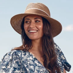 The Roma Toyo Straw Sun Hat in coffee-cream is a fantastic new summer style from Failsworth. It features a uniquely shaped crown and an elegant two-tone grosgrain hat band. The hat is unlined for breathability and comes with an adjustable sweatband for a perfect fit.
