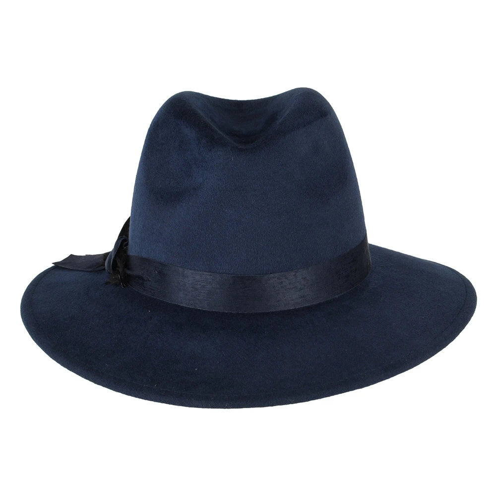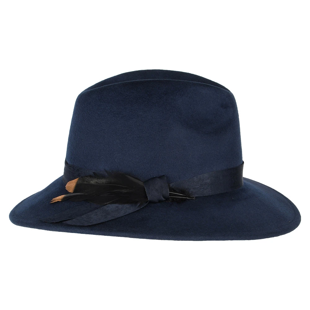 The Failsworth Hats Showerproof Wool Felt Fedora Hat With Feathers in navy blue will be your new wardrobe staple. Made of 100% wool, the hat is unlined and has an adjustable sweatband for comfort and a perfect fit. This hat is adorned with a soft hat band and golden tipped feathers on the side. The outer material has been coated to enhance water repellency and stain resistance. A beautiful hat for the season.