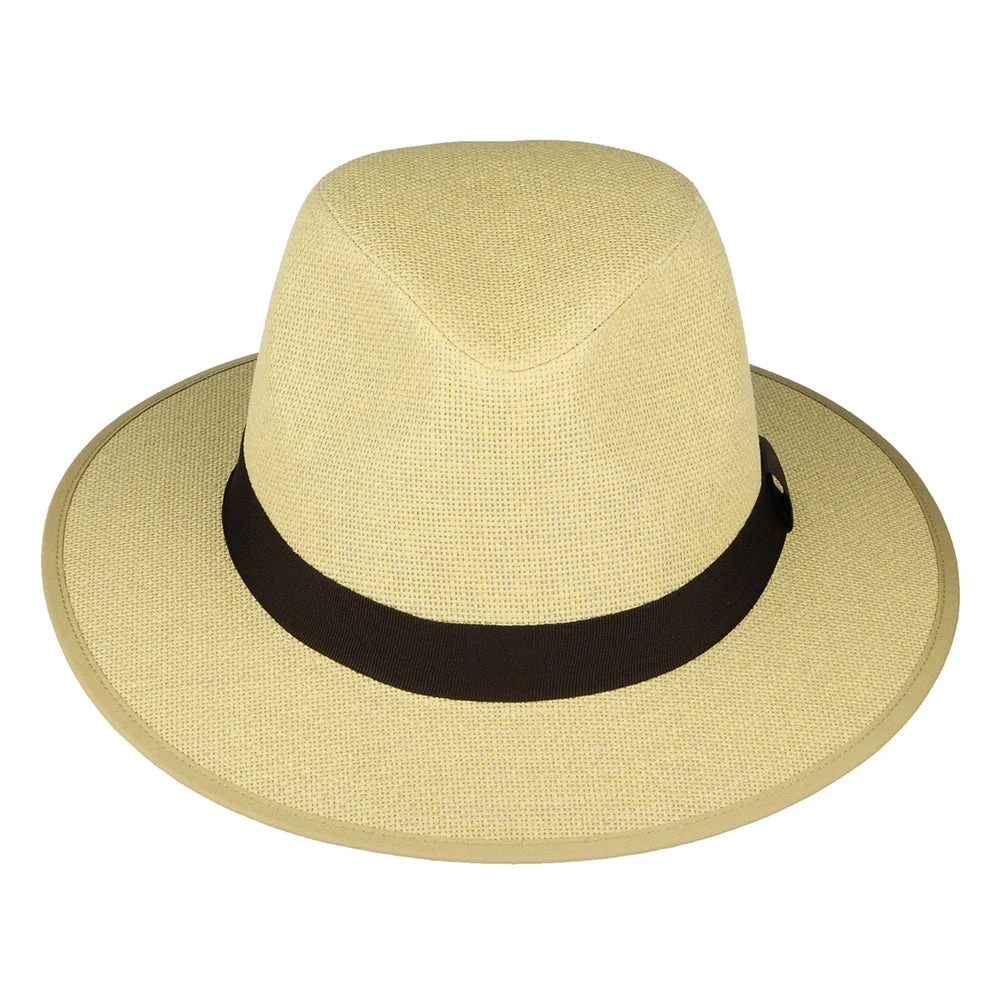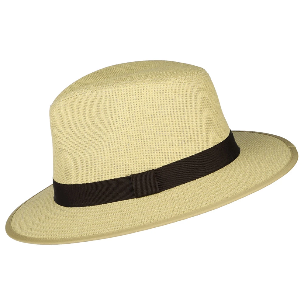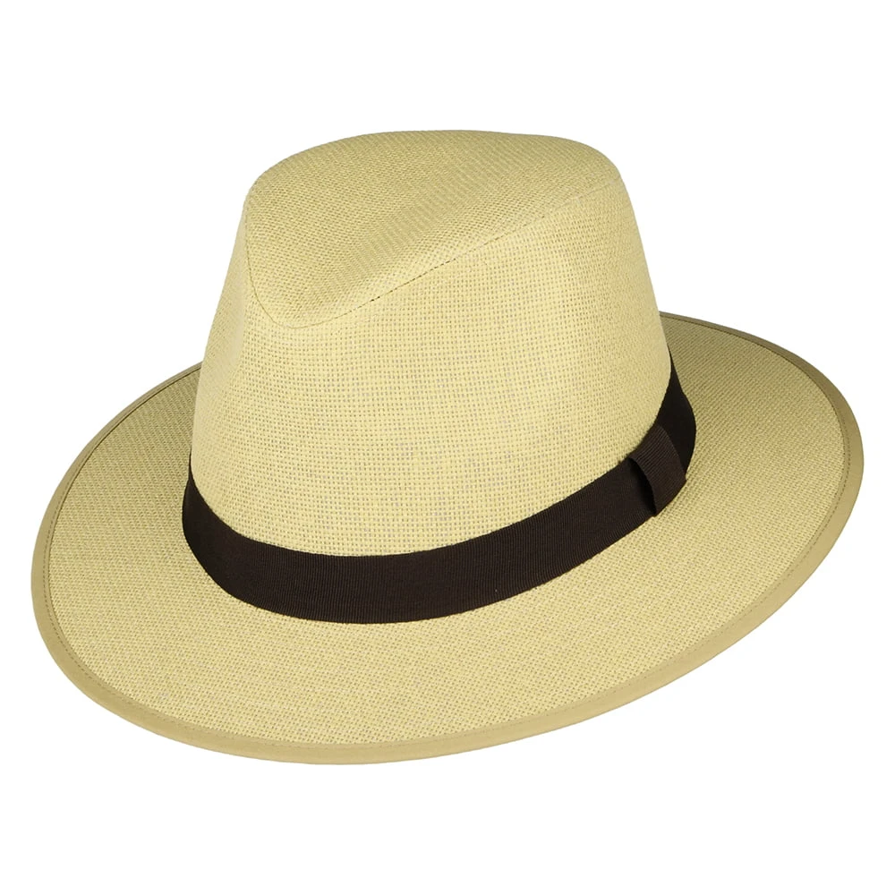 The Toyo Straw Safari Fedora Hat in tan from Failsworth is the perfect summer hat. The hat is decorated with a grosgrain hat band. The inside is lined with cotton and also features a cotton sweatband. A great hat for sunny days thanks to its UPF 40+ sun protection rating!