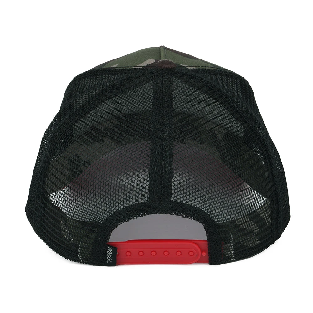 Proudly display your spirit animal with the Goorin Bros. Black Panther Trucker Cap in camouflage. This baseball cap features a mesh back and and an adjustable snapback for easy sizing. An embroidered Goorin label is sewn to the side of the brim and a unique patch is sewn on the structured front panel.