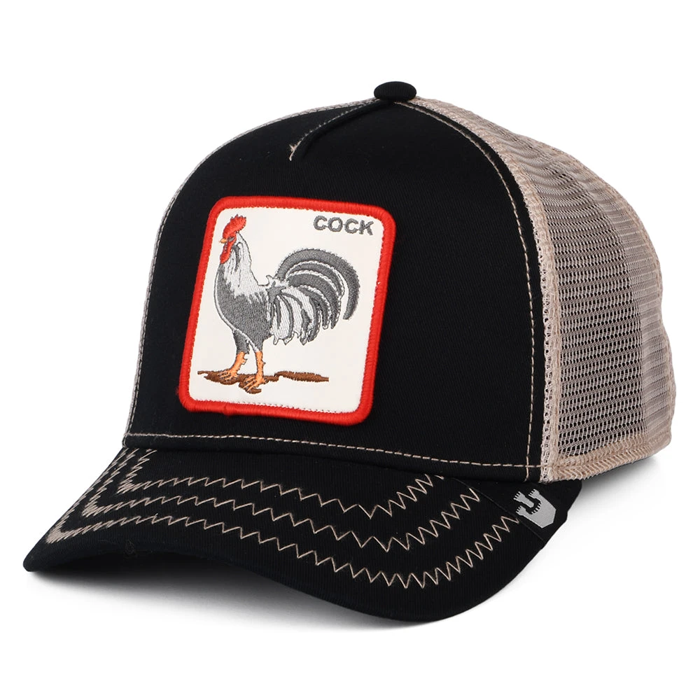 Proudly display your spirit animal with the Goorin Bros. Cock Trucker Cap in black. This baseball cap features a mesh back and and an adjustable snapback for easy sizing. An embroidered Goorin label is sewn to the side of the brim and a unique patch is sewn on the structured front panel.
