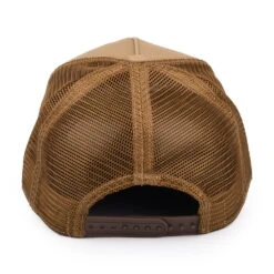 The Goorin Bros. King Lion Trucker Cap in brown features a mesh back and an adjustable snap at the back for easy sizing. An embroidered Goorin label is sewn to the side of the brim. A unique patch is sewn on the structured front panel.