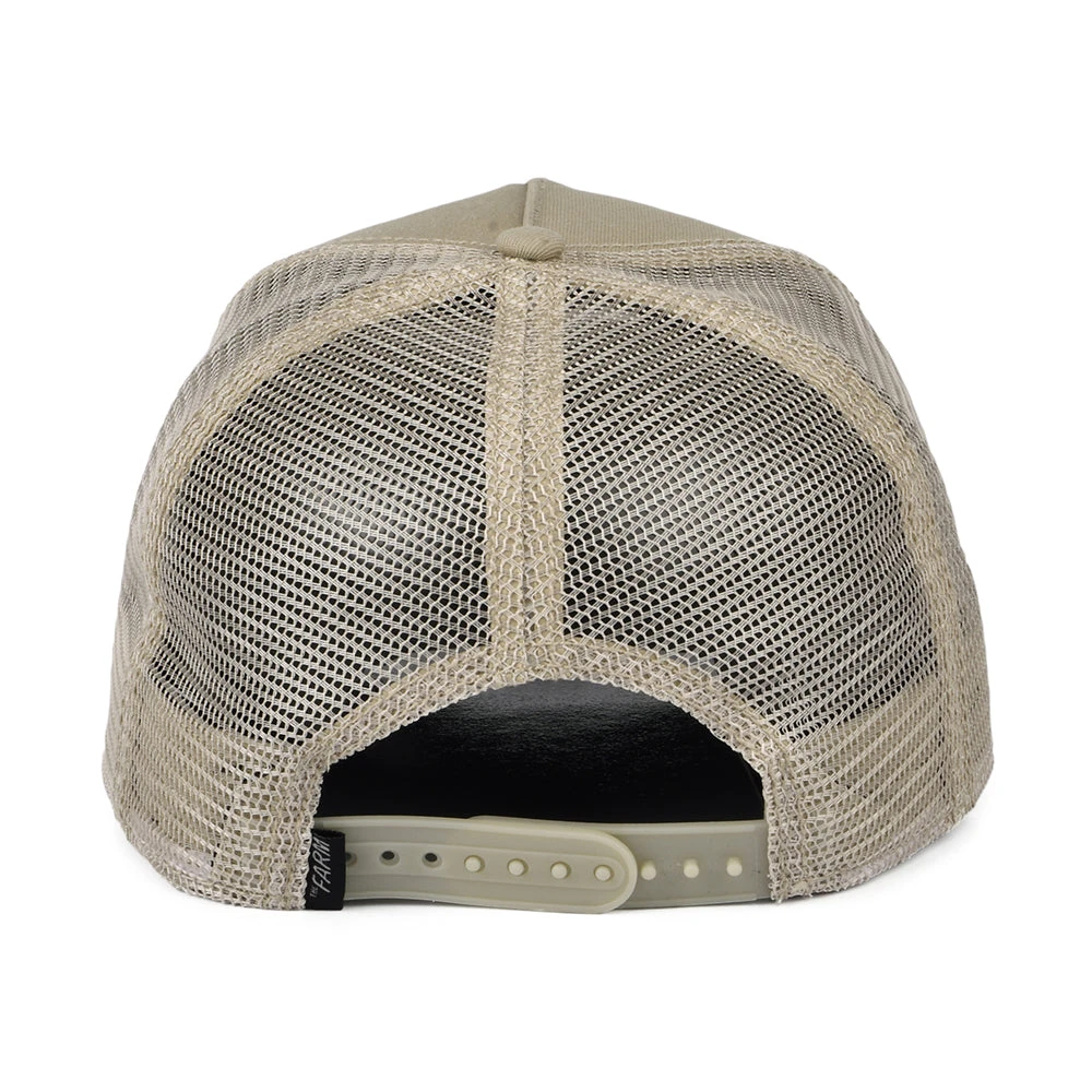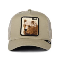 The Goorin Bros. The Bear Trucker Cap in khaki features a mesh back and an adjustable snap at the back for easy sizing. An embroidered Goorin label is sewn to the side of the brim. A unique patch is sewn on the structured front panel.