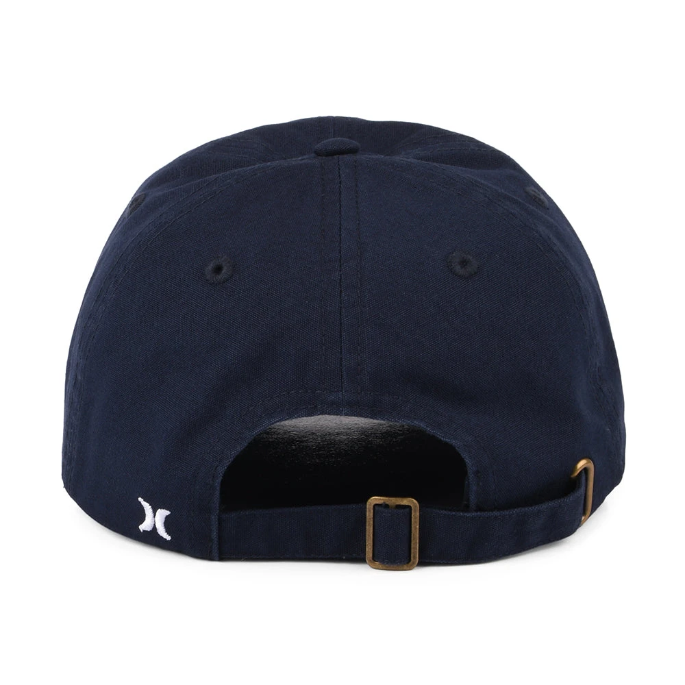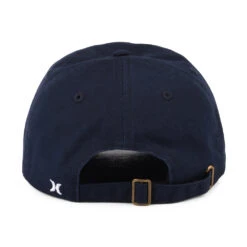 The Hurley Blank Canvas Baseball Cap in navy blue is made of 100% cotton. This unstructured baseball cap features a blank front and eyelets on the top for added breathability. A Hurley logo is embroidered next to the adjustable strap at the back.