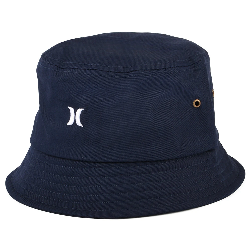 The Hurley Small Logo Bucket Hat in navy blue is made of 100% cotton and features a Hurley logo embroidered on the front. The hat is unlined and there are eyelets on the sides for added breathability.