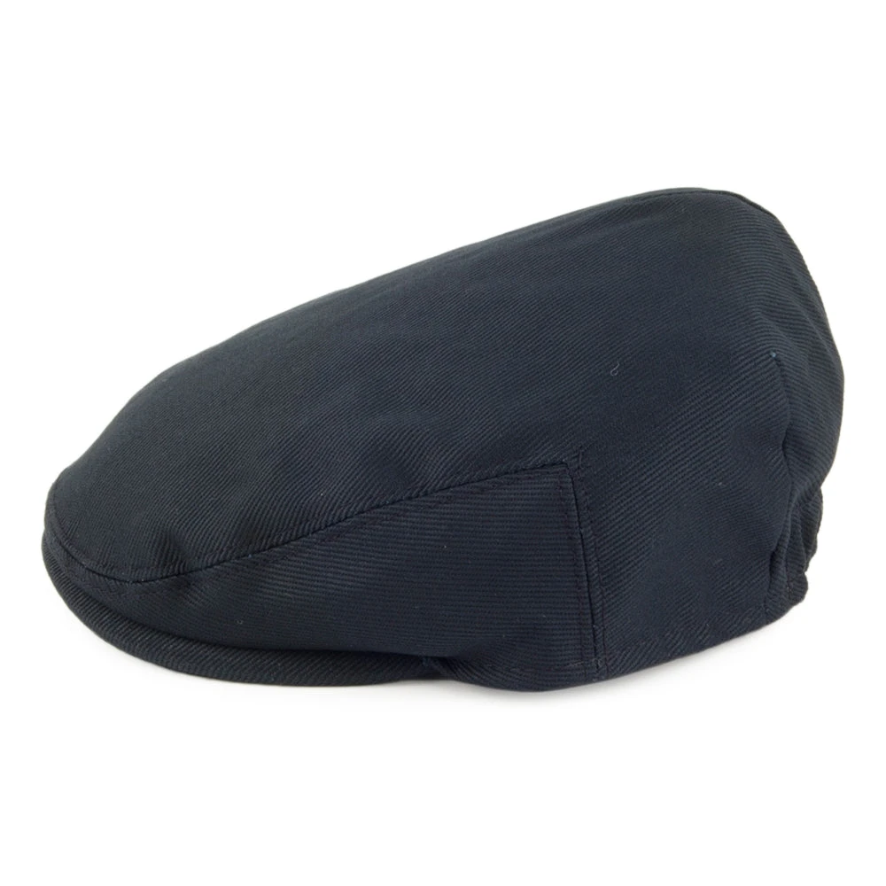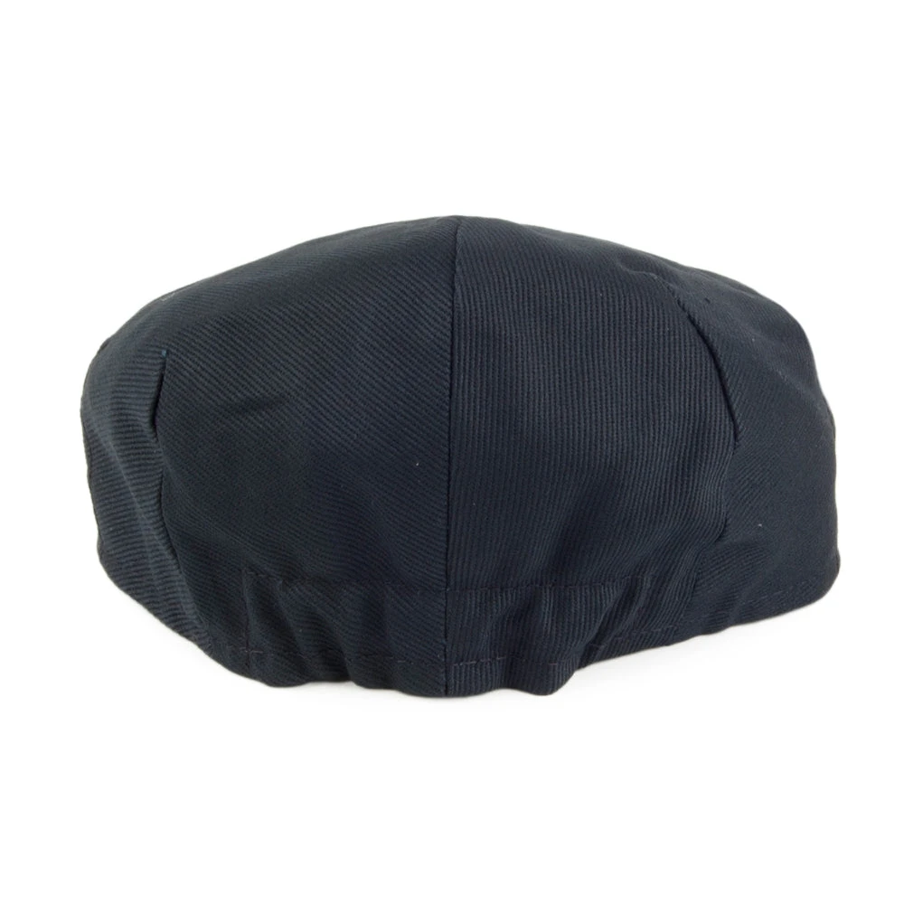 Here is the Jaxon & James Baby Cotton Flat Cap in navy blue. This simple summer flat cap style has been designed specifically for babies. It is made of 100% cotton and has a sewn down brim, grosgrain sweatband, satin lining and an elastic band at the back so it will stretch to fit.