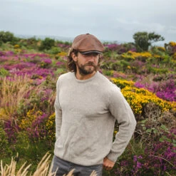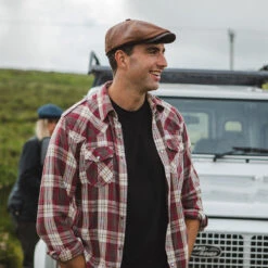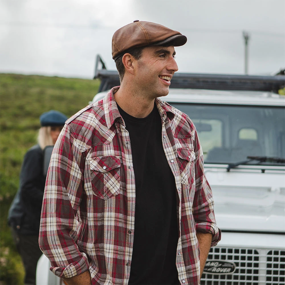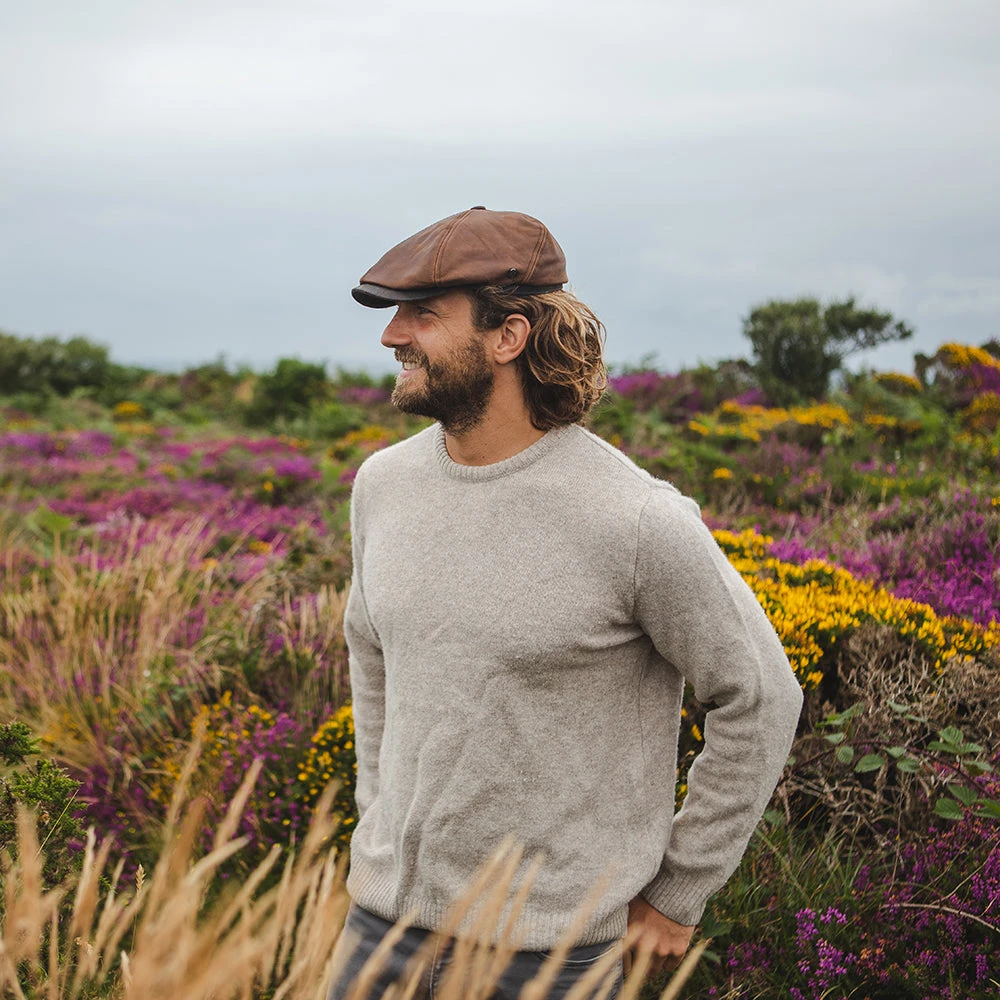 This is the Fulton Leather Flat Cap from Jaxon & James in brown. This stylish 100% leather cap has a 6 panel crown and a value on the top. The crown is sewn to the extended brim. Its lined for comfort and features a Jaxon & James pin on the side.