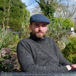 This is the Harris Tweed Herringbone Ardmore Flat Cap from Jaxon & James in blue-black. This great new genuine Harris Tweed style is made of 100% pure new wool, that has been dyed, spun and handwoven in the Outer Hebrides of Scotland. For extra comfort this hat has a quilted satin lining and a grosgrain sweatband. On the side is the Jaxon & James pin attached. The crown is sewn down to the visor. The Ardmore is an outstanding flat cap by the brand Jaxon & James!