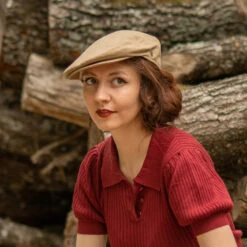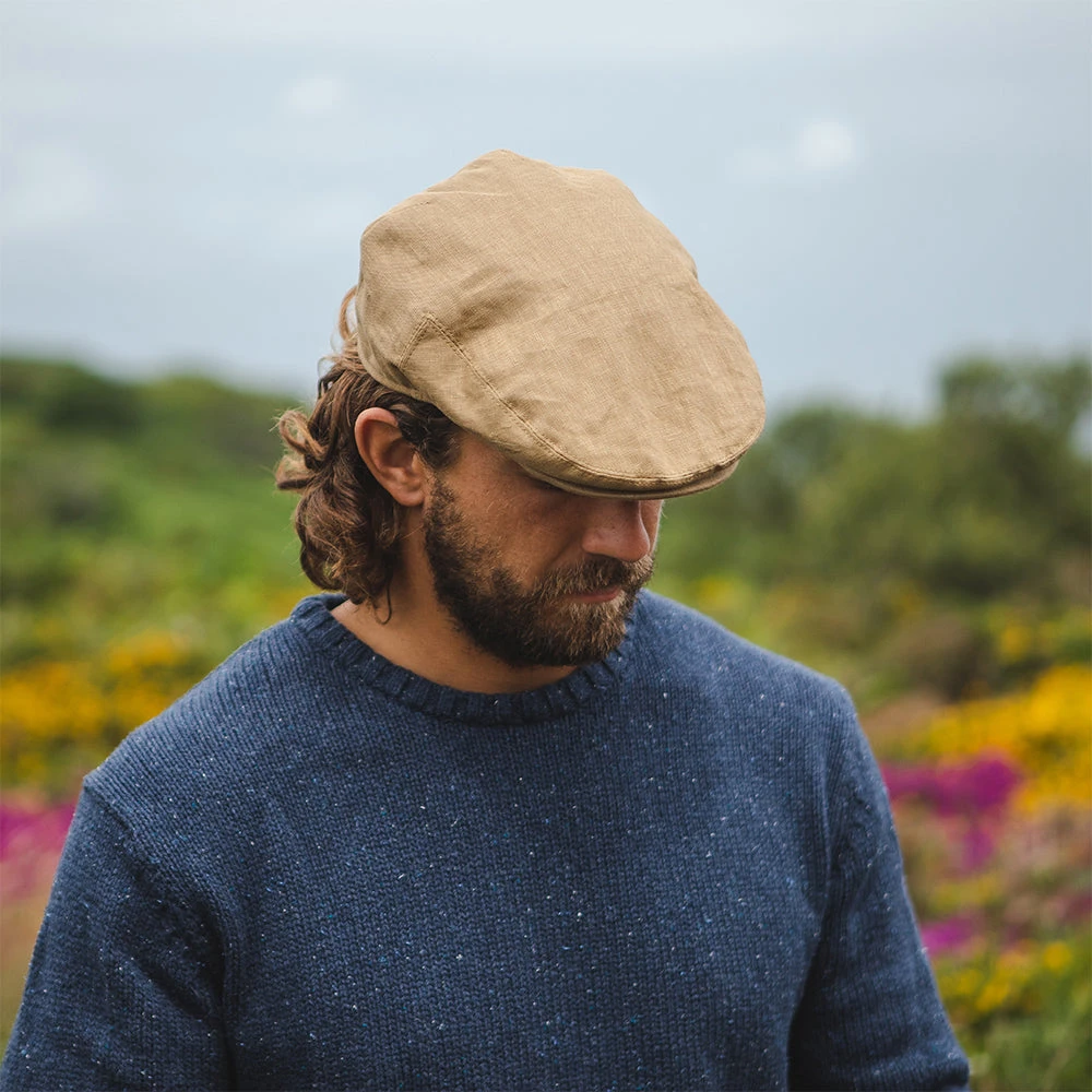 Here is the Jaxon & James Linen Flat Cap in camel. This 100% linen flat cap comes with a snap brim to maintain shape, a grosgrain sweatband, satin lining and removable Jaxon & James side pin.