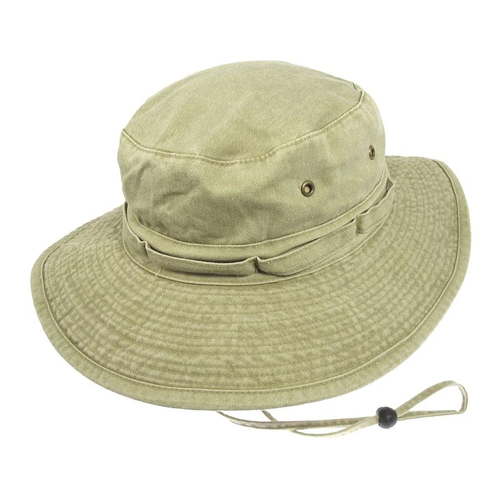Here is a 100% cotton boonie in khaki from Jaxon & James. The hat is great for everyday wear as well as for travelling. 100% washed cotton twill is soft yet durable. The 7cm wide stitched brim surrounds a 9cm high square crown. A pair of brass eyelets on each side of the crown provides ventilation under the hot sun. A self band provides spots for values or small outdoor tools. Adjustable chinstrap with toggle allows you to secure the hat onto your head.
