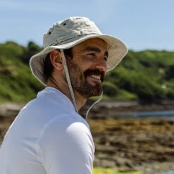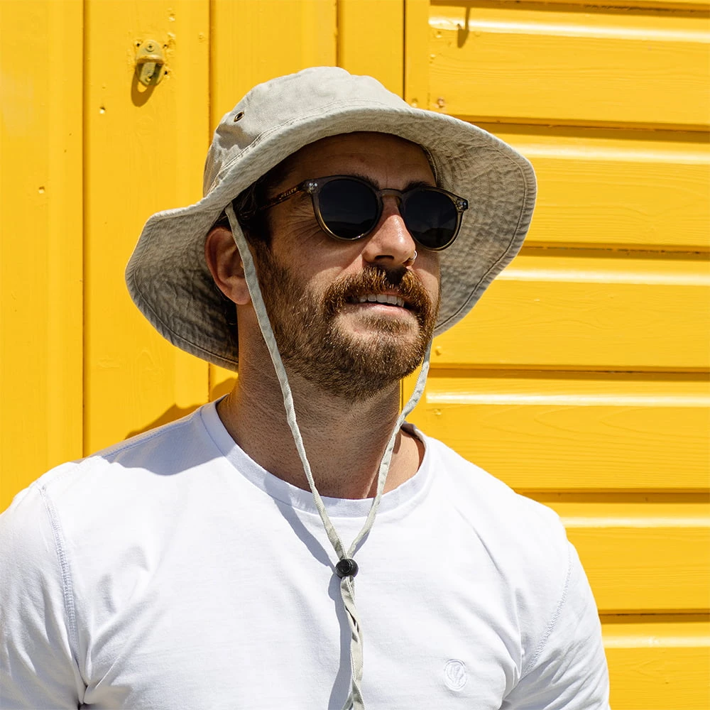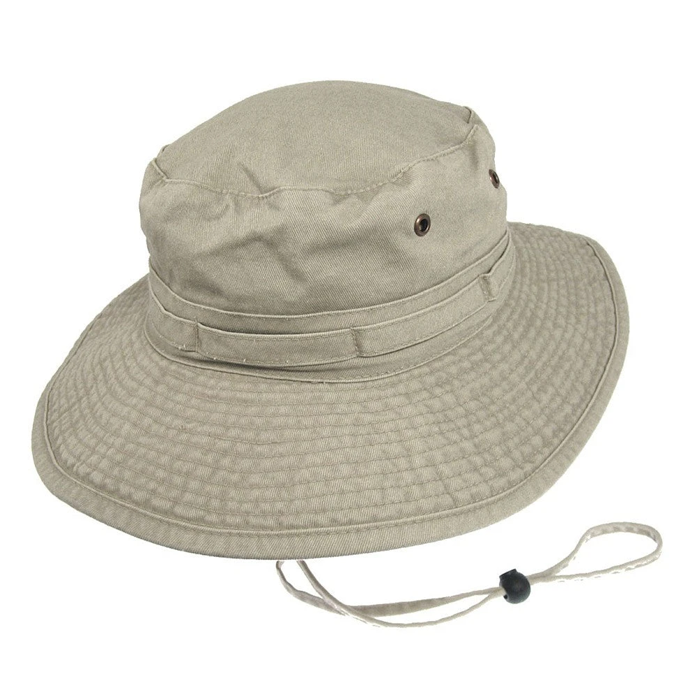 Here is a 100% cotton boonie in putty from Jaxon & James. The hat is great for everyday wear as well as for travelling. 100% washed cotton twill is soft yet durable. The 7cm wide stitched brim surrounds a 9cm high square crown. A pair of brass eyelets on each side of the crown provides ventilation under the hot sun. A self band provides spots for values or small outdoor tools. Adjustable chinstrap with toggle allows you to secure the hat onto your head.