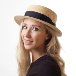 This is the Jaxon & James Straw Boater Hat with black band in natural. The Boater was for many decades the man’s straw hat of choice. Often associated with sailing, boating, barber shop quartets, jazz bands, and the like. The Boater was generally known as the warm weather hat.