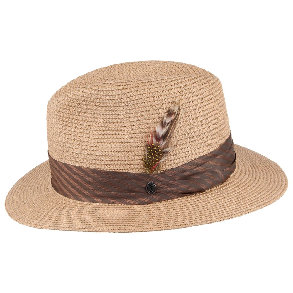 Here is the Jaxon & James Toyo Braided Fedora in a cappuccino colour. The classic safari shape has a down turned brim and a striped hat band. The brim is approximately 6cm wide and the crown is approximately 9.5cm tall. There is a decorative feather and Jaxon and James hat pin on the side of the hat.