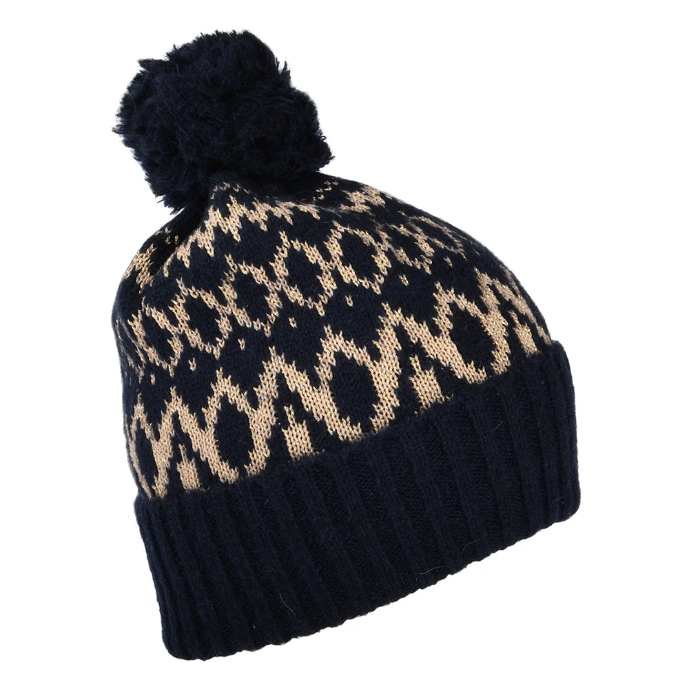 The Shetland Bobble Hat in navy blue is a fantastic new winter style from Joules. It features a diamond pattern across the crown with gold metallised fibres accents. There is a Joules badge sewn to the cuff of the hat. This is a beautiful addition to your winter wardrobe.