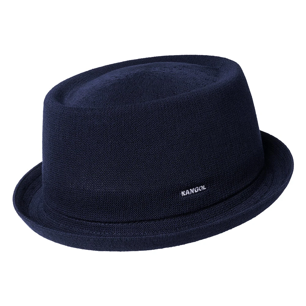 The Bamboo Mowbray in dark blue is a new Kangol pork pie hat that derives its name from one of Britain’s most delectable baked treats, the Mowbray Pork Pie. Like a classic pork pie hat, the Bamboo Mowbray has a telescopic crown and a stingy, upturned brim. Bamboo yarn is a soft handle, environmentally friendly yarn that has become an understated but chic staple in the Kangol range.