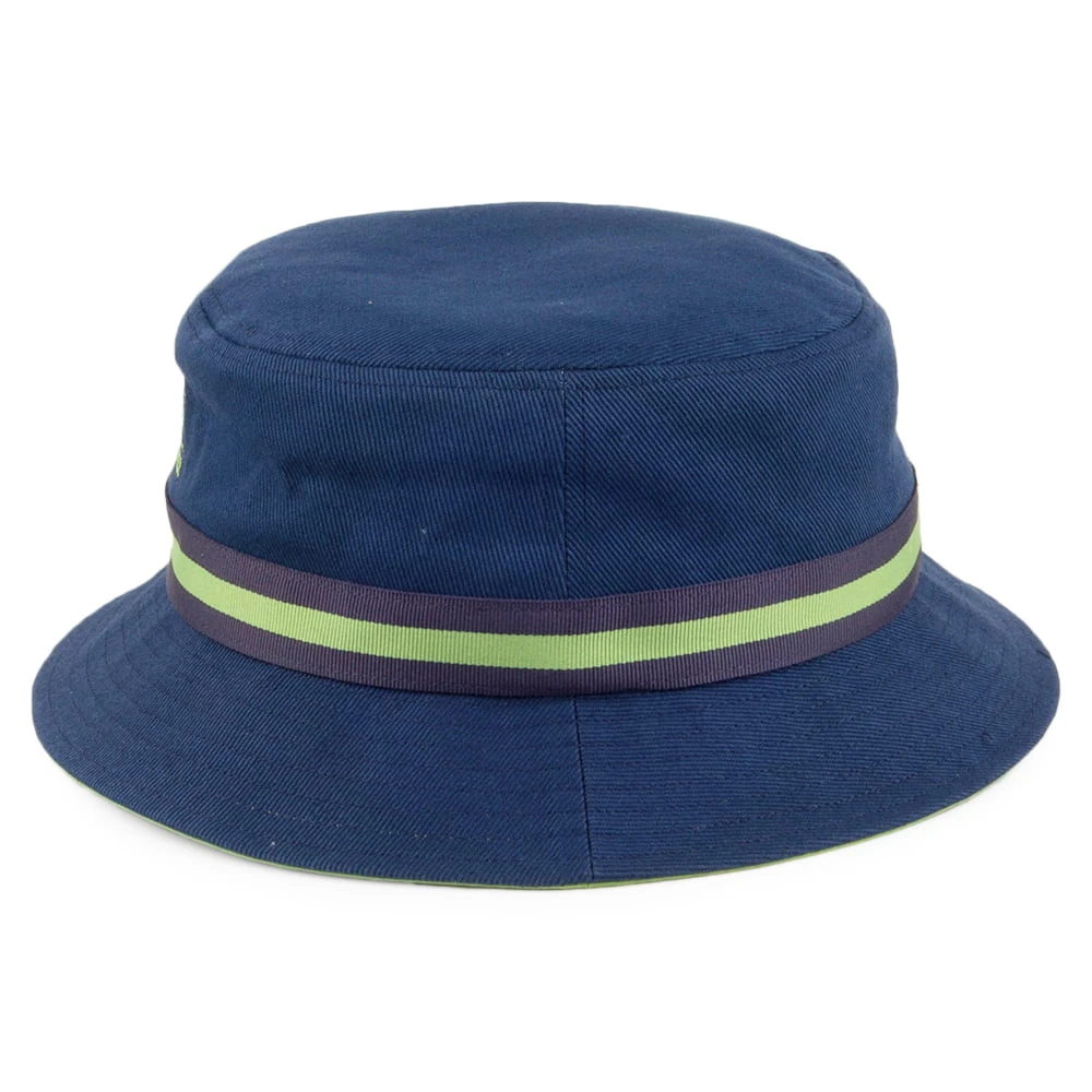 Here is the Kangol Stripe Lahinch Bucket Hat in navy blue. This is a homage to the Kangol bucket hats of the 1980’s. The hat has a stripe running around the hat and a matching Kangol logo embroidered on the front. The hat is made of 100% cotton and features a brim that is roughly 6cm wide.