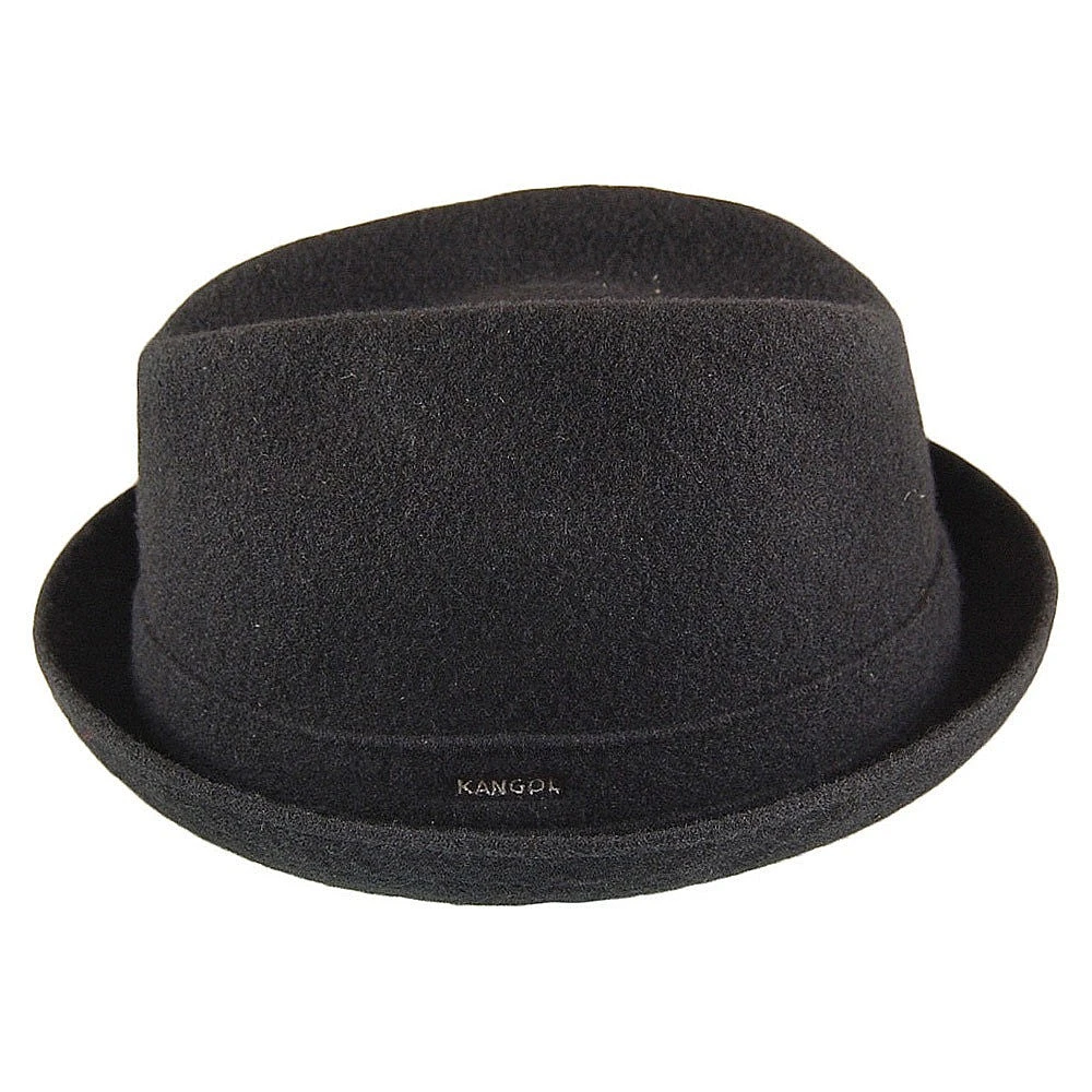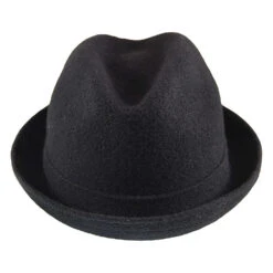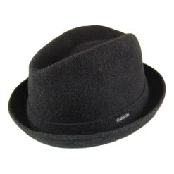 Here we have the Kangol Wool Player Trilby Hat in black. This is one of the hats that Kangol has made their reputation on. The hat has a 2 inch wide brim with an upturned brim. This produces the same effect on the 4 inch high crown by effectively eliminating the bottom part of the crown. It’s simple and classic, but still one of the coolest hats in the Kangol line.